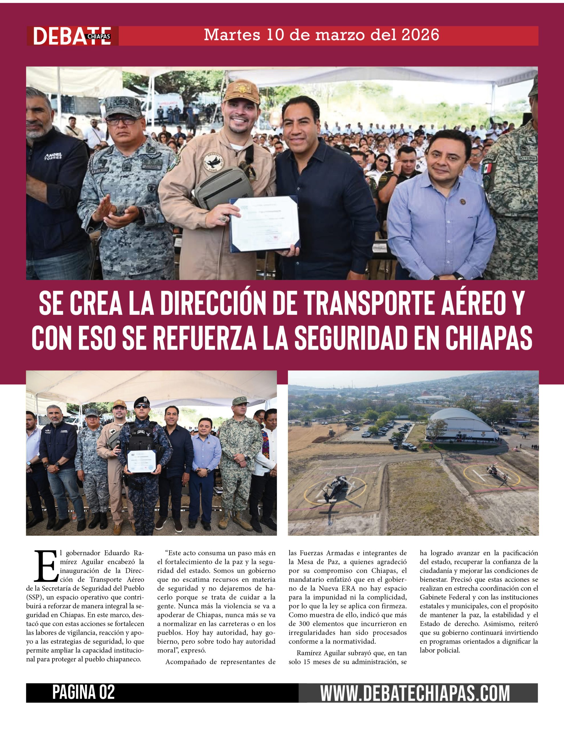 El gobernador Eduardo Ramírez Aguilar encabezó la inauguración de la Dirección de Transporte Aéreo de la Secretaría de Seguridad del Pueblo (SSP), un espacio operativo que contribuirá a reforzar de manera integral la seguridad en Chiapas. En este marco, destacó que con estas acciones se fortalecen las labores de vigilancia, reacción y apoyo a las estrategias de seguridad, lo que permite ampliar la capacidad institucional para proteger al pueblo chiapaneco.