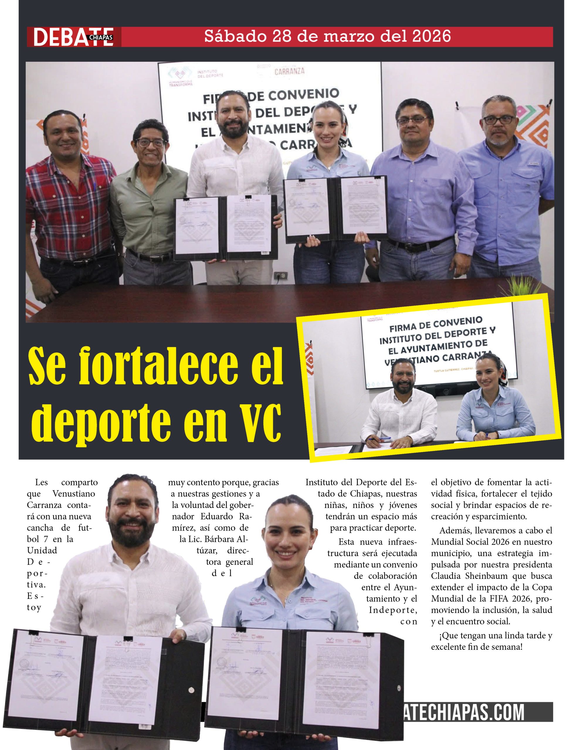 Les comparto que Venustiano Carranza contará con una nueva cancha de futbol 7 en la Unidad Deportiva. Estoy muy contento porque, gracias a nuestras gestiones y a la voluntad del gobernador Eduardo Ramírez, así como de la Lic. Bárbara Altúzar, directora general del Instituto del Deporte del Estado de Chiapas, nuestras niñas, niños y jóvenes tendrán un espacio más para practicar deporte.