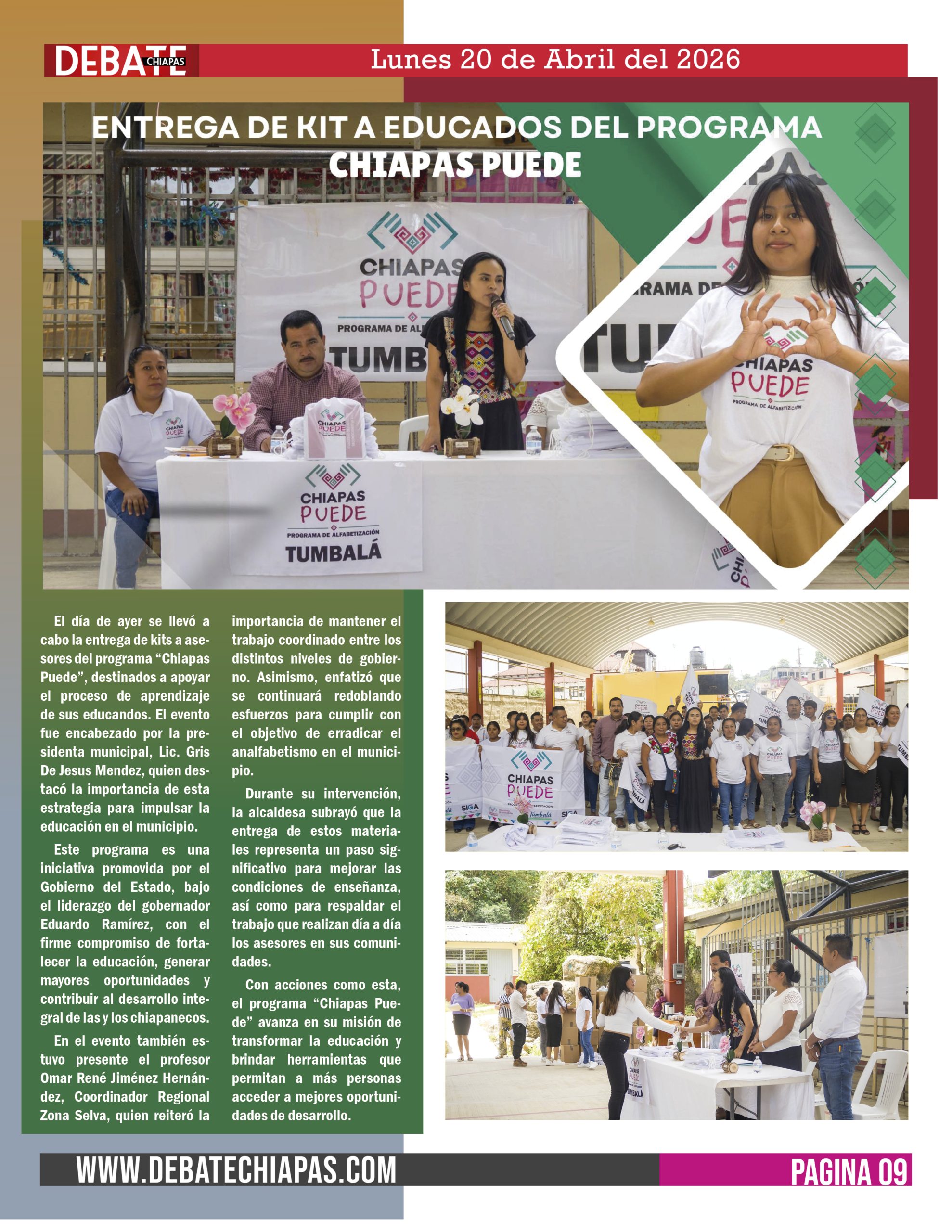 El día de ayer se llevó a cabo la entrega de kits a asesores del programa “Chiapas Puede”, destinados a apoyar el proceso de aprendizaje de sus educandos. El evento fue encabezado por la presidenta municipal, Lic. Gris De Jesus Mendez, quien destacó la importancia de esta estrategia para impulsar la educación en el municipio.