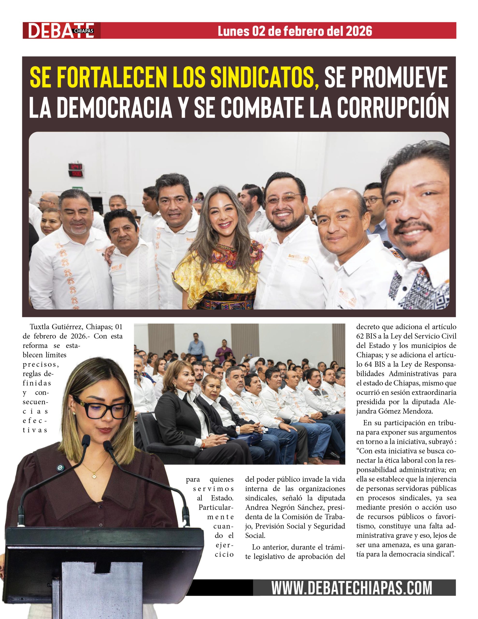 Tuxtla Gutiérrez, Chiapas; 01 de febrero de 2026.- Con esta reforma se establecen límites precisos, reglas definidas y consecuencias efectivas para quienes servimos al Estado. Particularmente cuando el ejercicio del poder público invade la vida interna de las organizaciones sindicales, señaló la diputada Andrea Negrón Sánchez, presidenta de la Comisión de Trabajo, Previsión Social y Seguridad Social.
