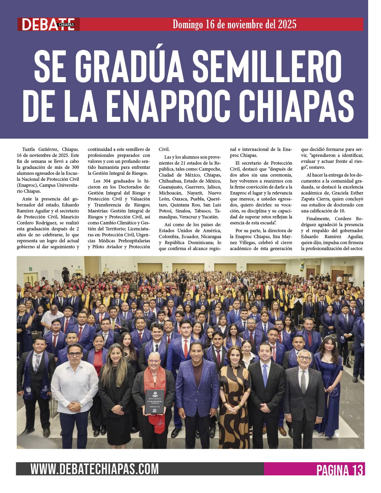 Tuxtla Gutiérrez, Chiapas. 16 de noviembre de 2025. Este fin de semana se llevó a cabo la graduación de más de 300 alumnos egresados de la Escuela Nacional de Protección Civil (Enaproc), Campus Universitario Chiapas.
