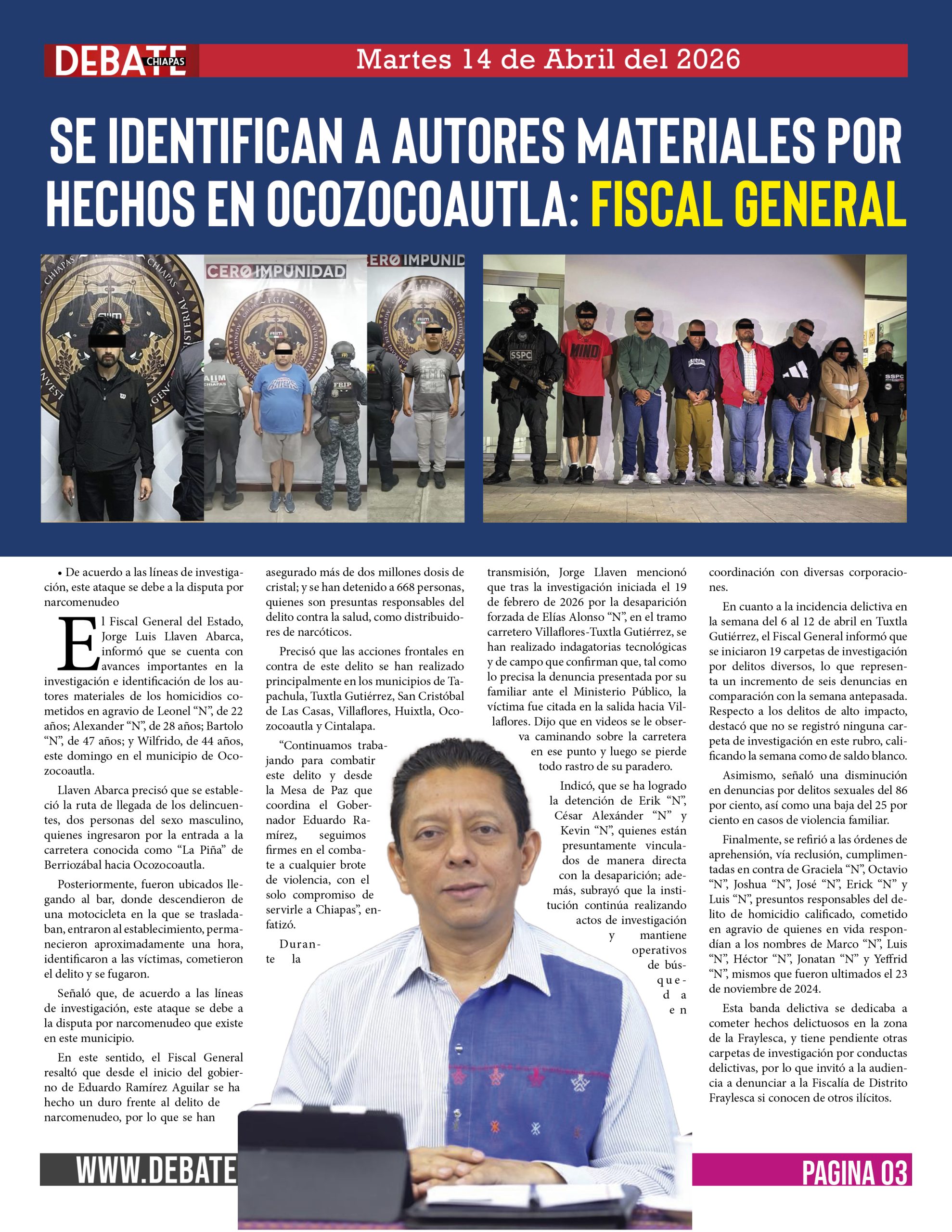 El Fiscal General del Estado, Jorge Luis Llaven Abarca, informó que se cuenta con avances importantes en la investigación e identificación de los autores materiales de los homicidios cometidos en agravio de Leonel “N”, de 22 años; Alexander “N”, de 28 años; Bartolo “N”, de 47 años; y Wilfrido, de 44 años, este domingo en el municipio de Ocozocoautla.
