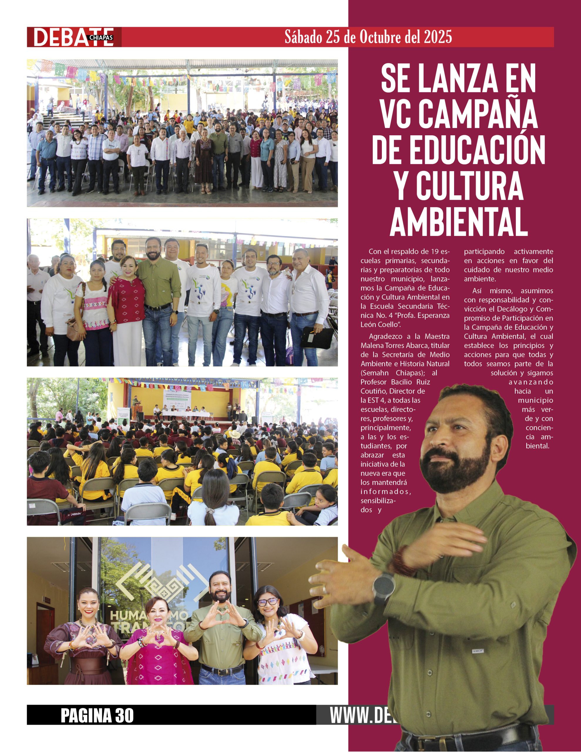 Agradezco a la Maestra Malena Torres Abarca, titular de la Secretaría de Medio Ambiente e Historia Natural (Semahn Chiapas); al Profesor Bacilio Ruiz Coutiño, Director de la EST 4, a todas las escuelas, directores, profesores y, principalmente, a las y los estudiantes, por abrazar esta iniciativa de la nueva era que los mantendrá informados, sensibilizados y participando activamente en acciones en favor del cuidado de nuestro medio ambiente.