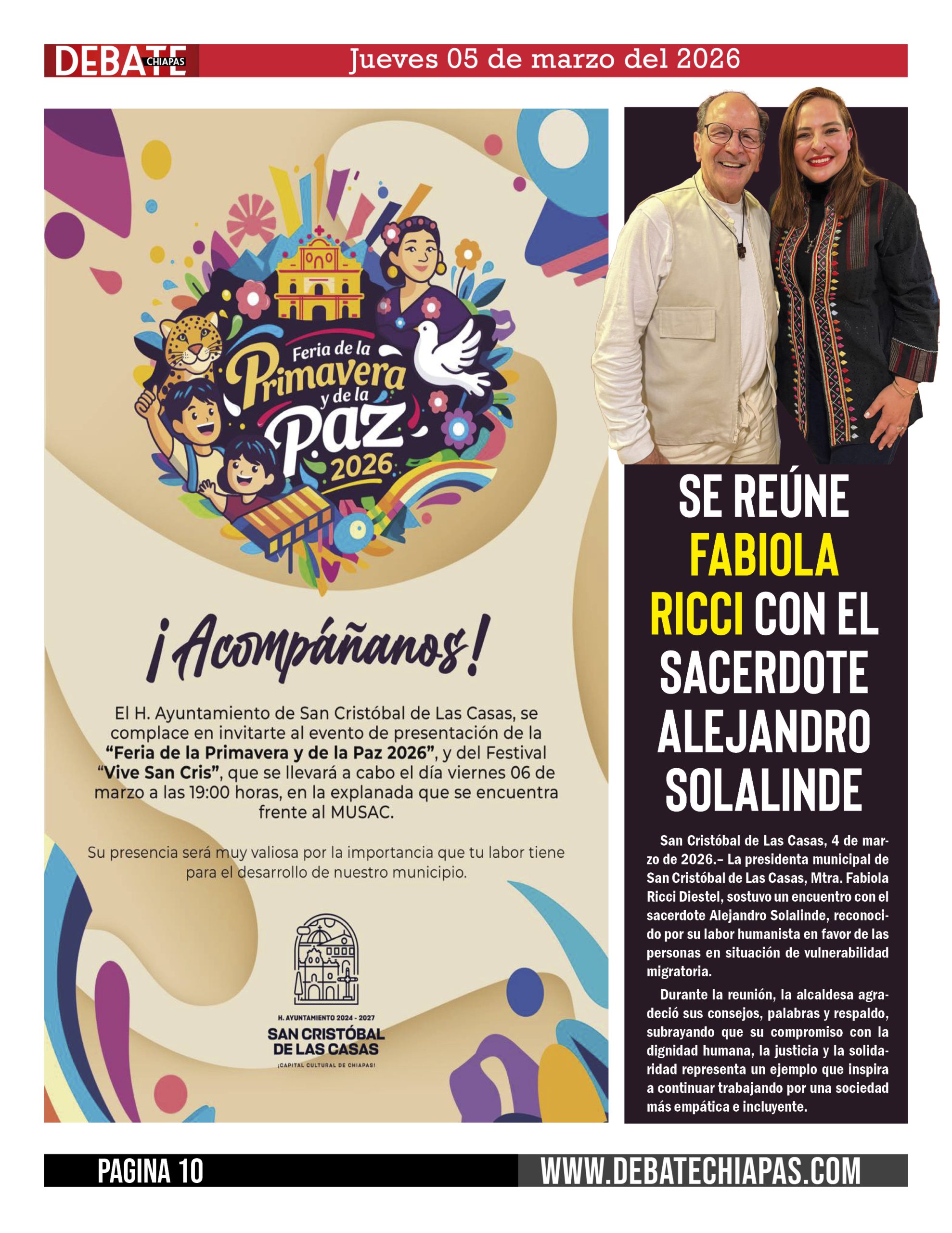 San Cristóbal de Las Casas, 4 de marzo de 2026.– La presidenta municipal de San Cristóbal de Las Casas, Mtra. Fabiola Ricci Diestel, sostuvo un encuentro con el sacerdote Alejandro Solalinde, reconocido por su labor humanista en favor de las personas en situación de vulnerabilidad migratoria.