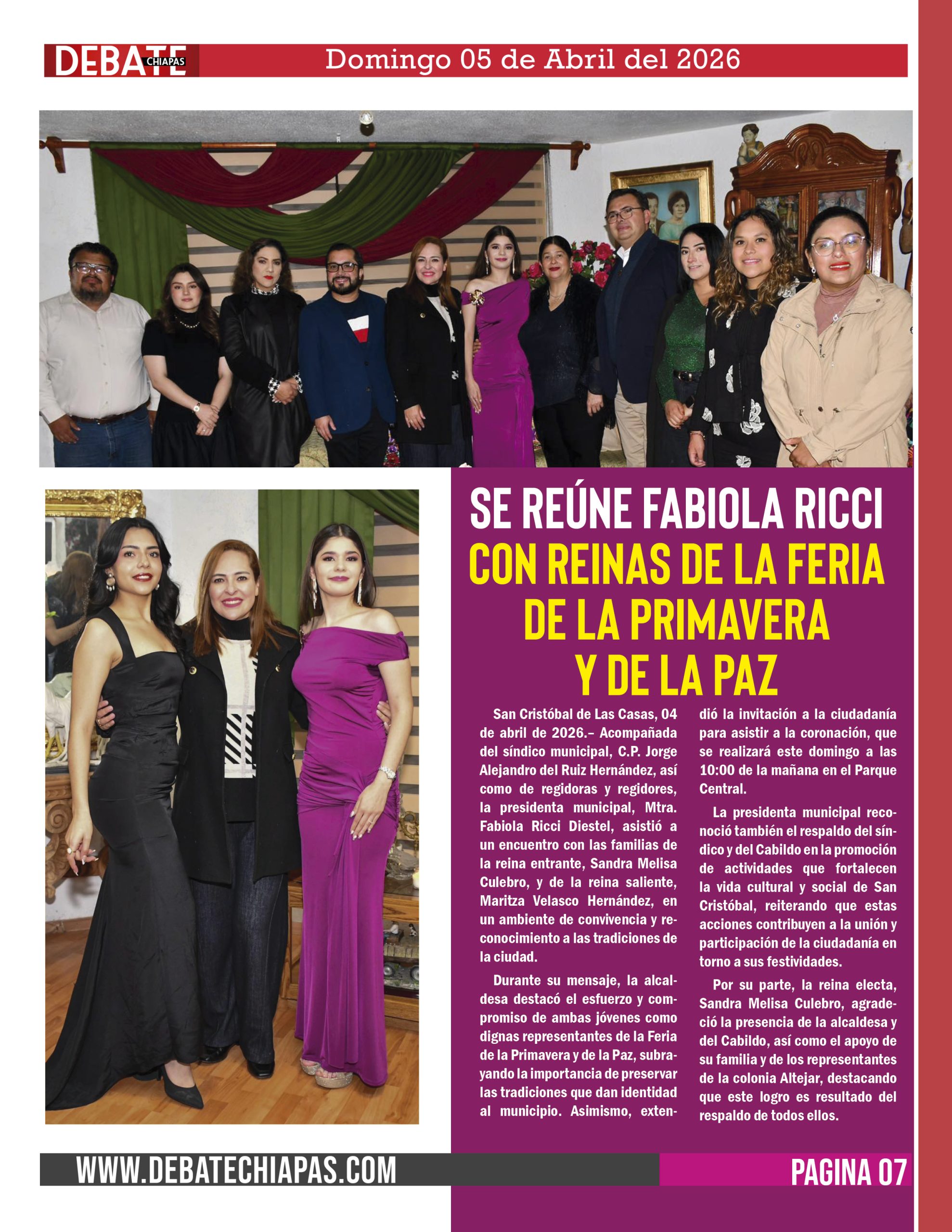 San Cristóbal de Las Casas, 04 de abril de 2026.– Acompañada del síndico municipal, C.P. Jorge Alejandro del Ruiz Hernández, así como de regidoras y regidores, la presidenta municipal, Mtra. Fabiola Ricci Diestel, asistió a un encuentro con las familias de la reina entrante, Sandra Melisa Culebro, y de la reina saliente, Maritza Velasco Hernández, en un ambiente de convivencia y reconocimiento a las tradiciones de la ciudad.