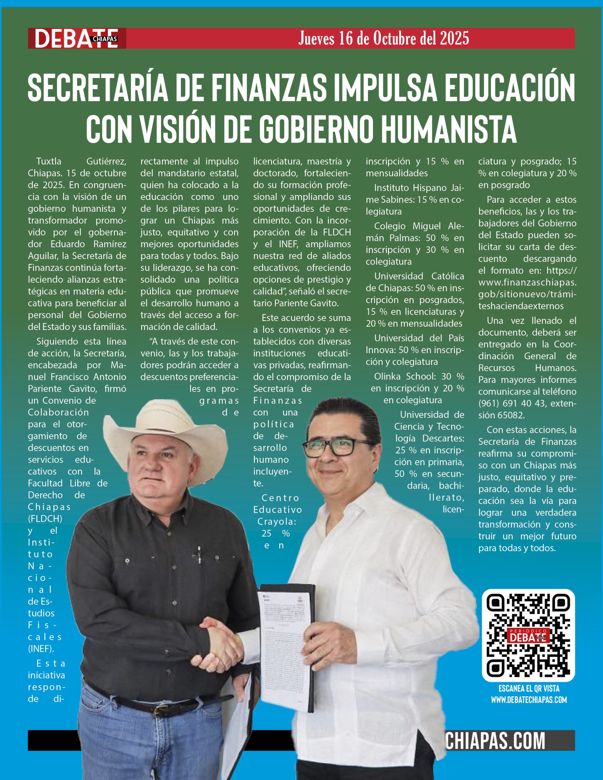 Tuxtla Gutiérrez, Chiapas. 15 de octubre de 2025. En congruencia con la visión de un gobierno humanista y transformador promovido por el gobernador Eduardo Ramírez Aguilar, la Secretaría de Finanzas continúa fortaleciendo alianzas estratégicas en materia educativa para beneficiar al personal del Gobierno del Estado y sus familias.
