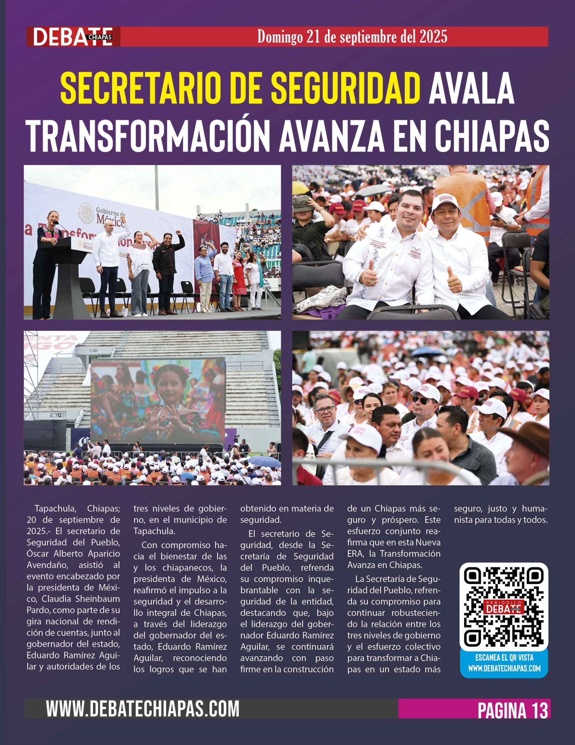 Con compromiso hacia el bienestar de las y los chiapanecos, la presidenta de México, reafirmó el impulso a la seguridad y el desarrollo integral de Chiapas, a través del liderazgo del gobernador del estado, Eduardo Ramírez Aguilar, reconociendo los logros que se han obtenido en materia de seguridad.