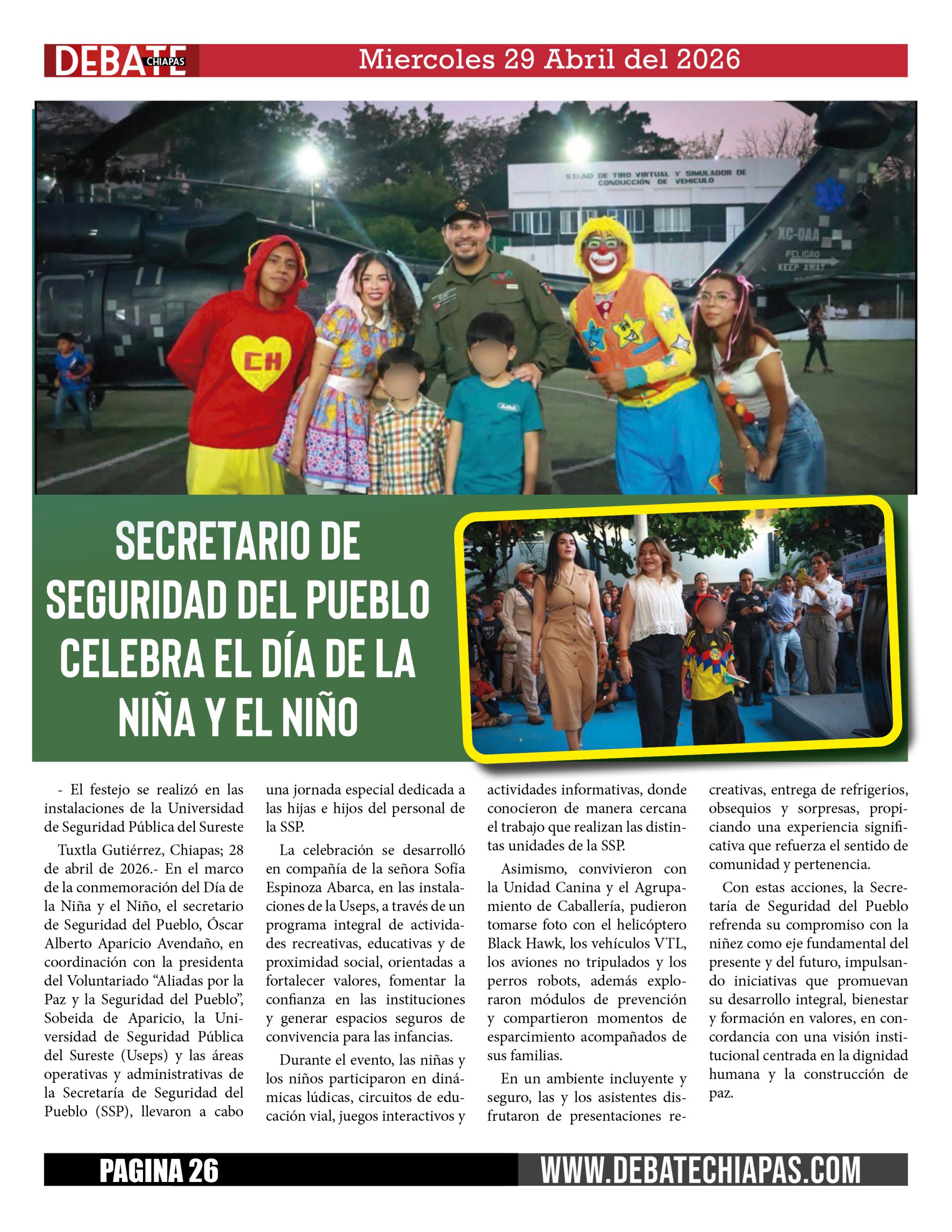 Tuxtla Gutiérrez, Chiapas; 28 de abril de 2026.- En el marco de la conmemoración del Día de la Niña y el Niño, el secretario de Seguridad del Pueblo, Óscar Alberto Aparicio Avendaño, en coordinación con la presidenta del Voluntariado “Aliadas por la Paz y la Seguridad del Pueblo”, Sobeida de Aparicio, la Universidad de Seguridad Pública del Sureste (Useps) y las áreas operativas y administrativas de la Secretaría de Seguridad del Pueblo (SSP), llevaron a cabo una jornada especial dedicada a las hijas e hijos del personal de la SSP.