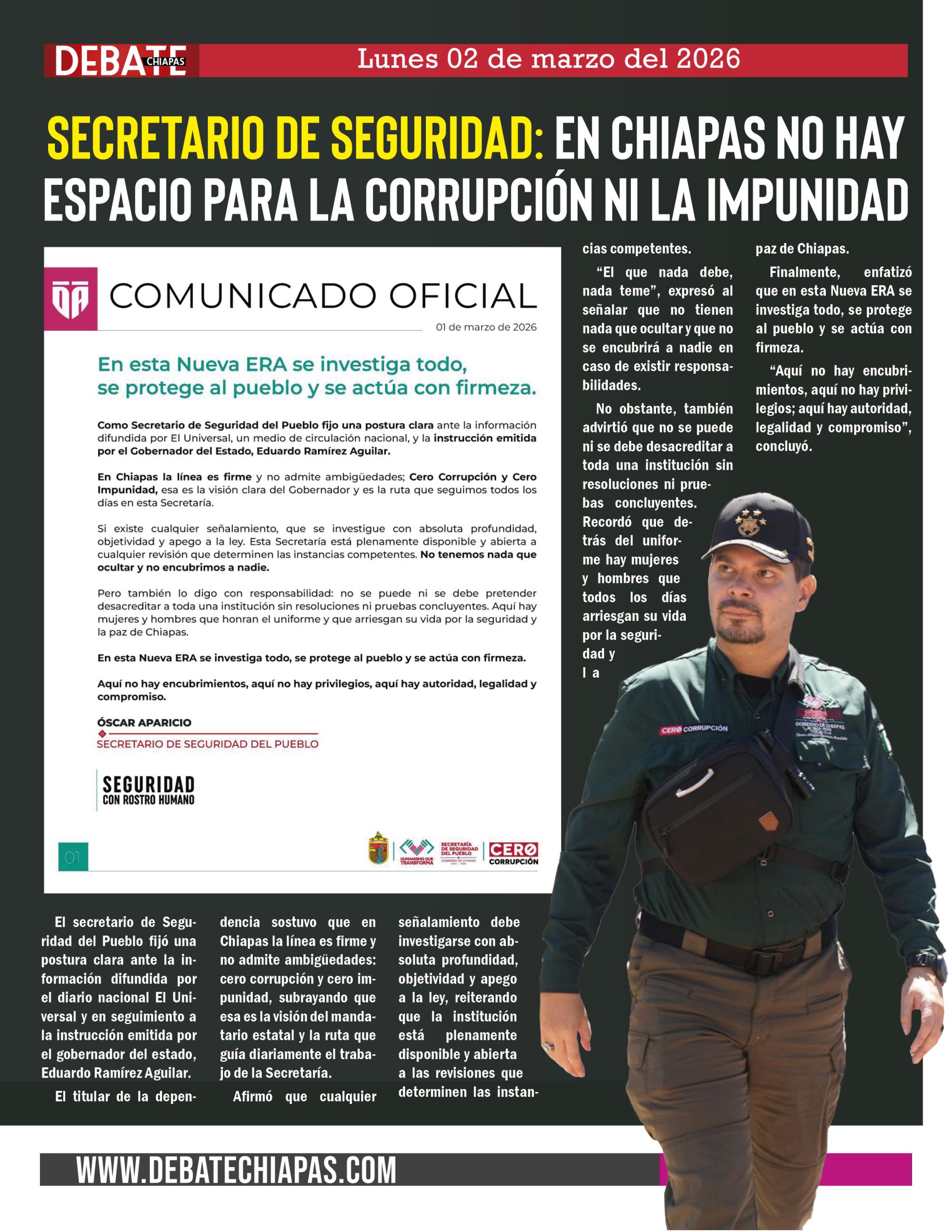 No obstante, también advirtió que no se puede ni se debe desacreditar a toda una institución sin resoluciones ni pruebas concluyentes. Recordó que detrás del uniforme hay mujeres y hombres que todos los días arriesgan su vida por la seguridad y la paz de Chiapas.