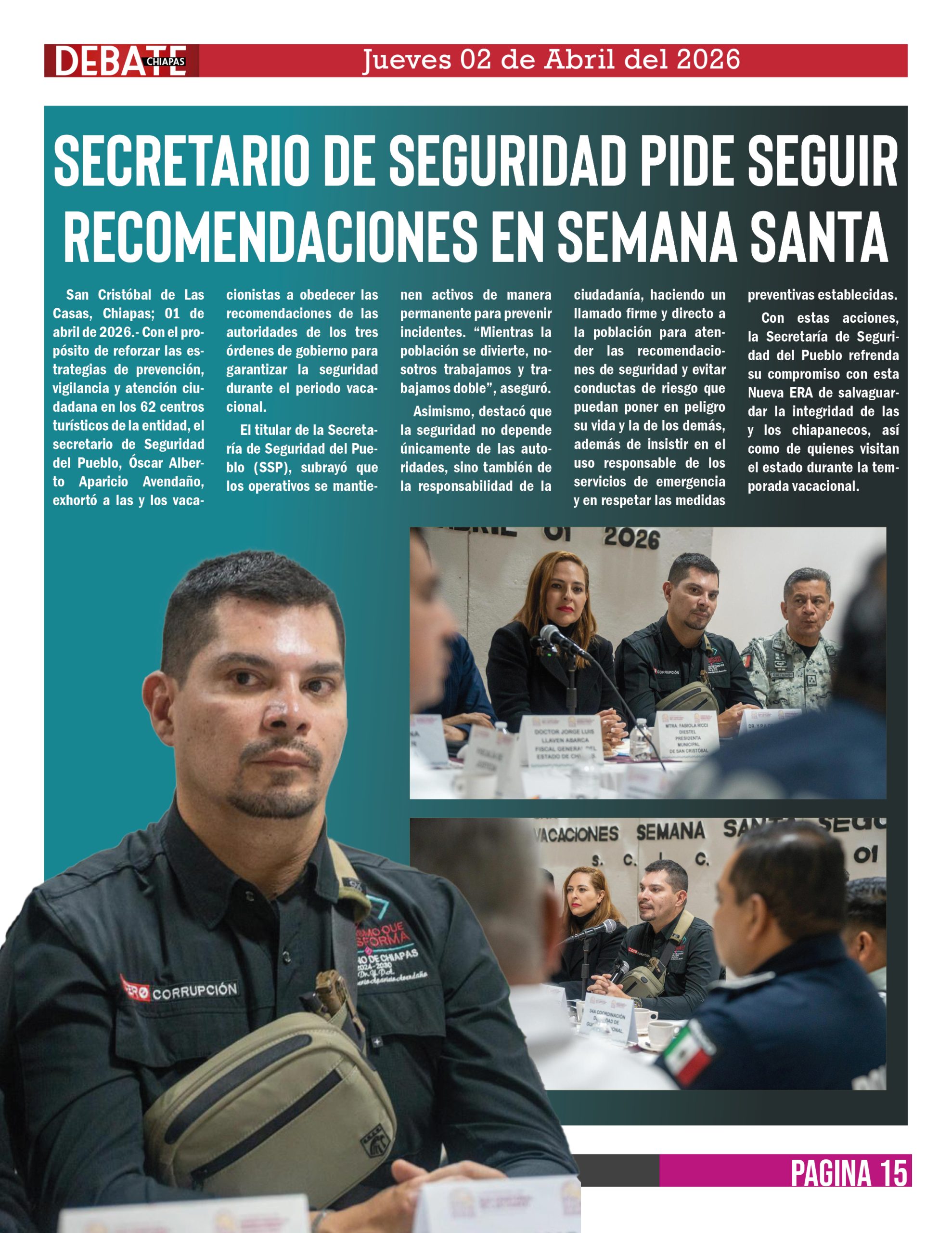 San Cristóbal de Las Casas, Chiapas; 01 de abril de 2026.- Con el propósito de reforzar las estrategias de prevención, vigilancia y atención ciudadana en los 62 centros turísticos de la entidad, el secretario de Seguridad del Pueblo, Óscar Alberto Aparicio Avendaño, exhortó a las y los vacacionistas a obedecer las recomendaciones de las autoridades de los tres órdenes de gobierno para garantizar la seguridad durante el periodo vacacional.