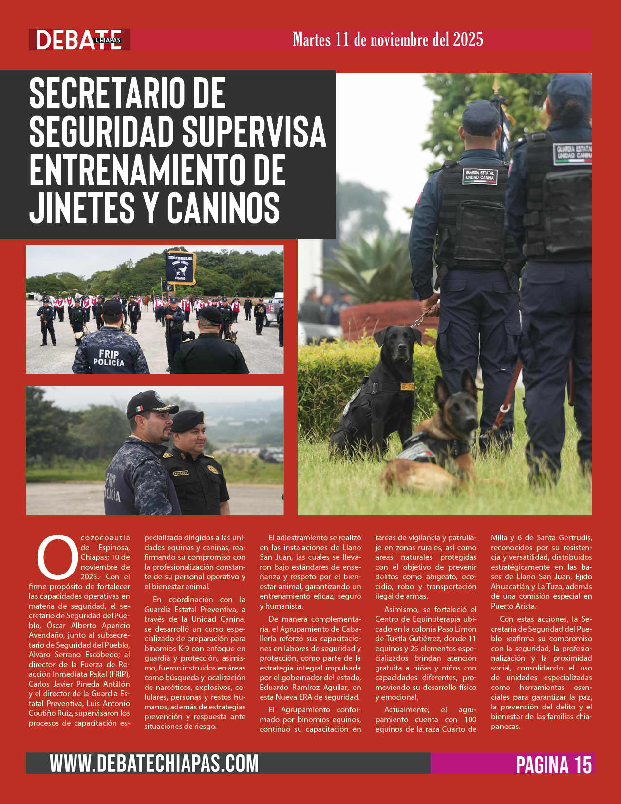 Ocozocoautla de Espinosa, Chiapas; 10 de noviembre de 2025.- Con el firme propósito de fortalecer las capacidades operativas en materia de seguridad, el secretario de Seguridad del Pueblo, Óscar Alberto Aparicio Avendaño, junto al subsecretario de Seguridad del Pueblo, Álvaro Serrano Escobedo; al director de la Fuerza de Reacción Inmediata Pakal (FRIP), Carlos Javier Pineda Antillón y el director de la Guardia Estatal Preventiva, Luis Antonio Coutiño Ruiz, supervisaron los procesos de capacitación especializada dirigidos a las unidades equinas y caninas, reafirmando su compromiso con la profesionalización constante de su personal operativo y el bienestar animal.