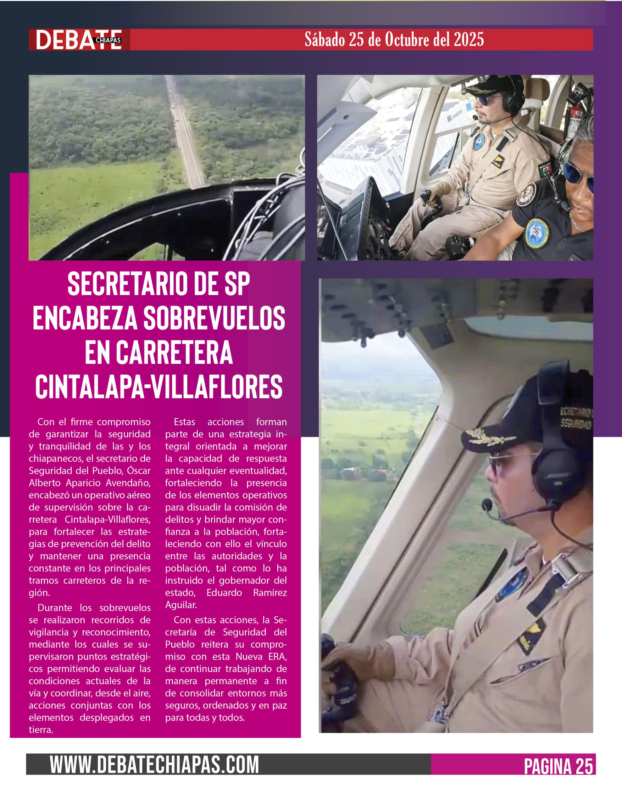 Con el firme compromiso de garantizar la seguridad y tranquilidad de las y los chiapanecos, el secretario de Seguridad del Pueblo, Óscar Alberto Aparicio Avendaño, encabezó un operativo aéreo de supervisión sobre la carretera Cintalapa-Villaflores, para fortalecer las estrategias de prevención del delito y mantener una presencia constante en los principales tramos carreteros de la región.