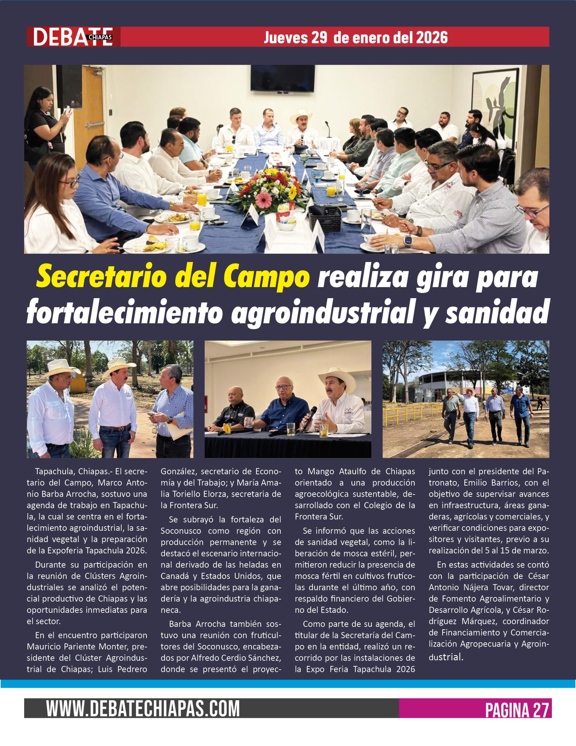 Tapachula, Chiapas.- El secretario del Campo, Marco Antonio Barba Arrocha, sostuvo una agenda de trabajo en Tapachula, la cual se centra en el fortalecimiento agroindustrial, la sanidad vegetal y la preparación de la Expoferia Tapachula 2026.