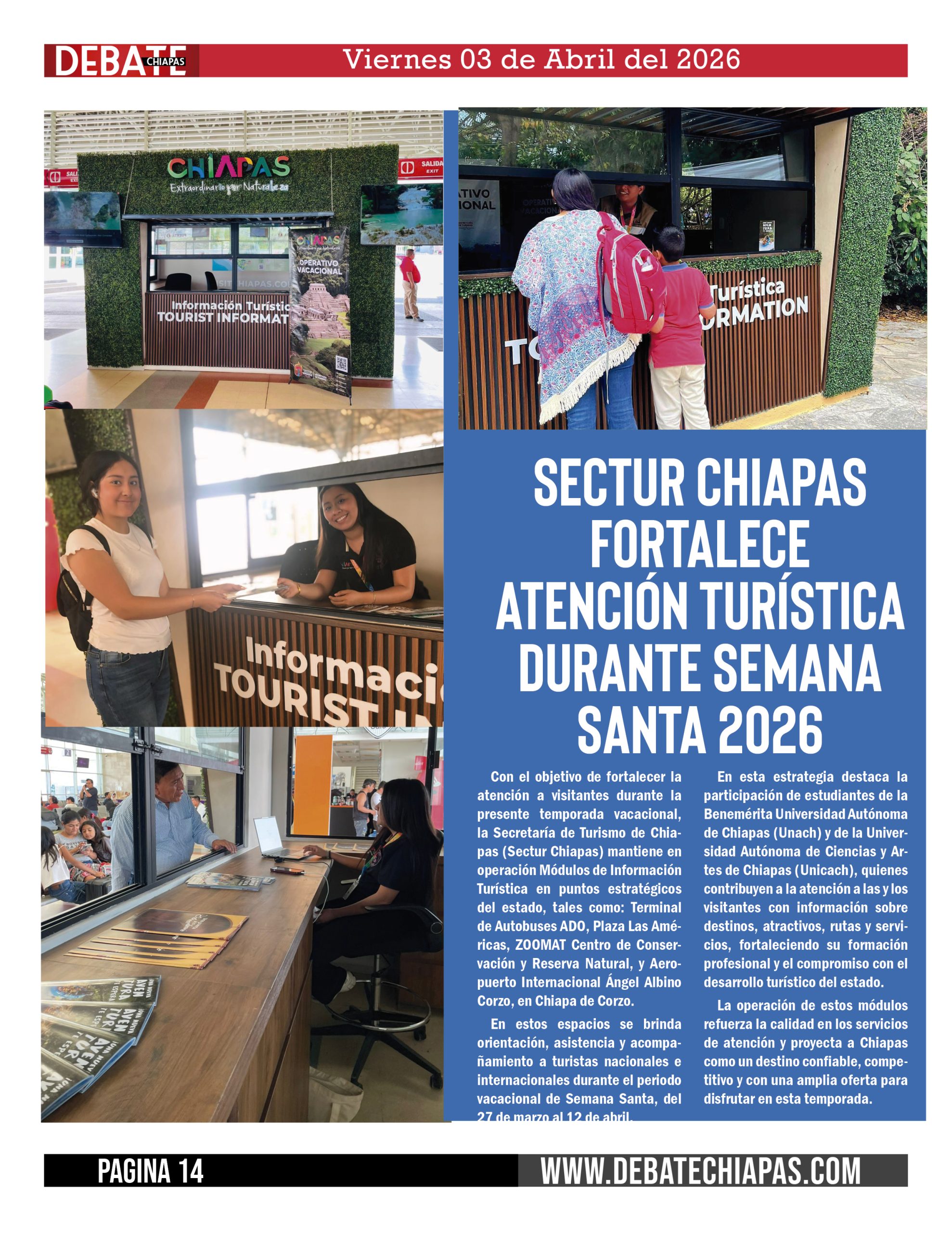 Con el objetivo de fortalecer la atención a visitantes durante la presente temporada vacacional, la Secretaría de Turismo de Chiapas (Sectur Chiapas) mantiene en operación Módulos de Información Turística en puntos estratégicos del estado, tales como: Terminal de Autobuses ADO, Plaza Las Américas, ZOOMAT Centro de Conservación y Reserva Natural, y Aeropuerto Internacional Ángel Albino Corzo, en Chiapa de Corzo.