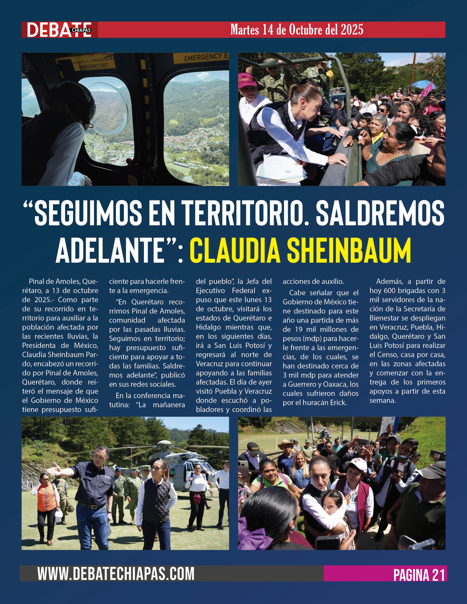 En la conferencia matutina: “La mañanera del pueblo”, la Jefa del Ejecutivo Federal expuso que este lunes 13 de octubre, visitará los estados de Querétaro e Hidalgo mientras que, en los siguientes días, irá a San Luis Potosí y regresará al norte de Veracruz para continuar apoyando a las familias afectadas. El día de ayer visitó Puebla y Veracruz donde escuchó a pobladores y coordinó las acciones de auxilio.