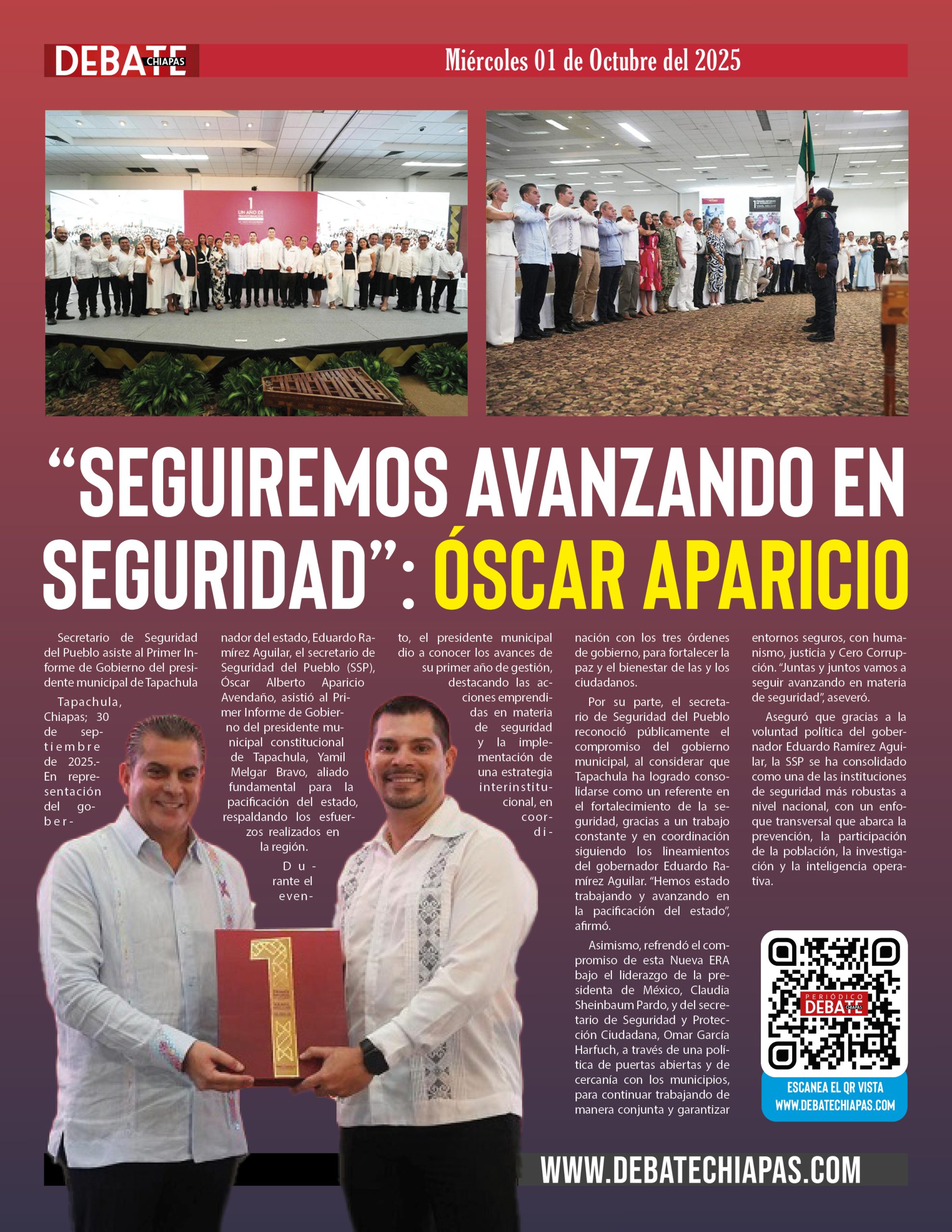 Tapachula, Chiapas; 30 de septiembre de 2025.- En representación del gobernador del estado, Eduardo Ramírez Aguilar, el secretario de Seguridad del Pueblo (SSP), Óscar Alberto Aparicio Avendaño, asistió al Primer Informe de Gobierno del presidente municipal constitucional de Tapachula, Yamil Melgar Bravo, aliado fundamental para la pacificación del estado, respaldando los esfuerzos realizados en la región.