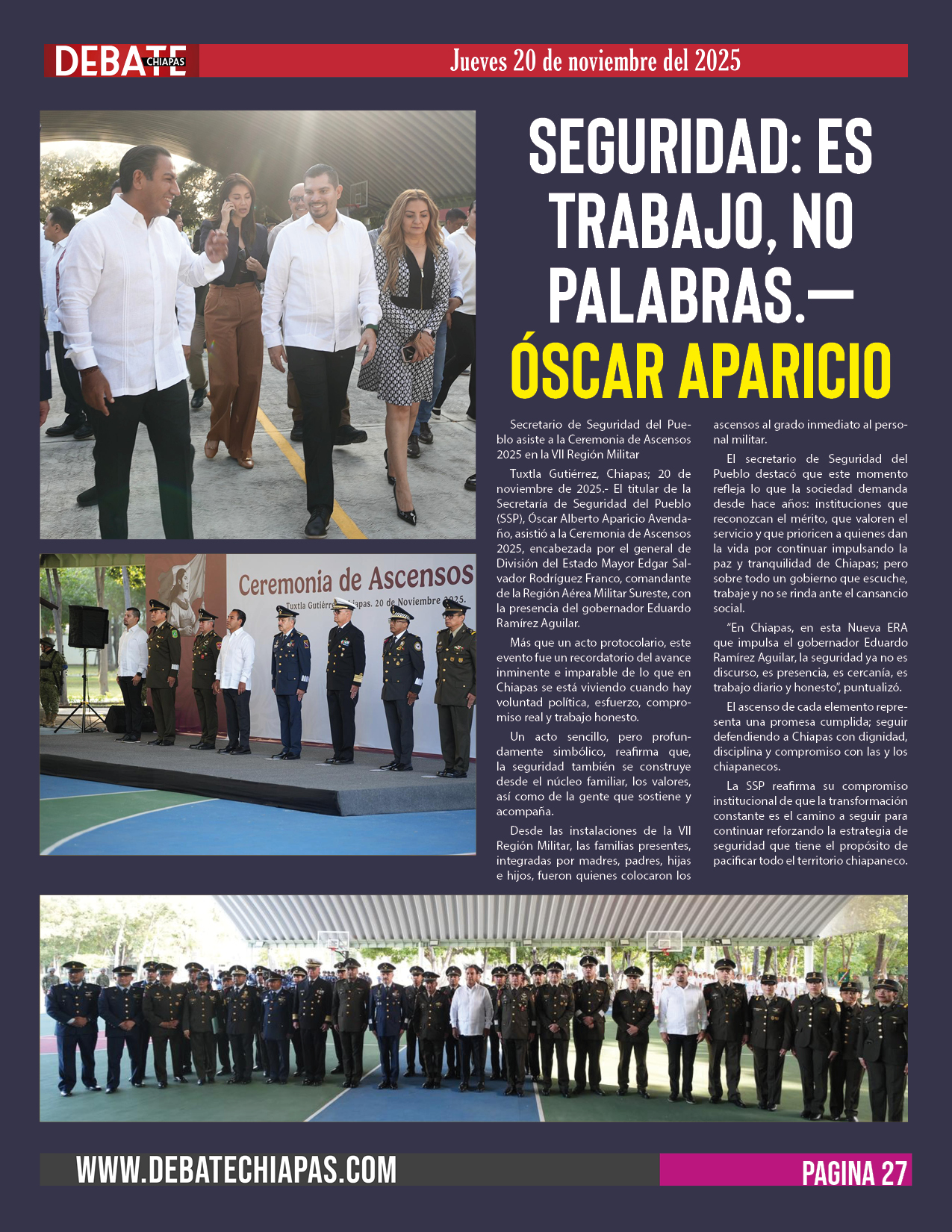 “En Chiapas, en esta Nueva ERA que impulsa el gobernador Eduardo Ramírez Aguilar, la seguridad ya no es discurso, es presencia, es cercanía, es trabajo diario y honesto”, puntualizó.