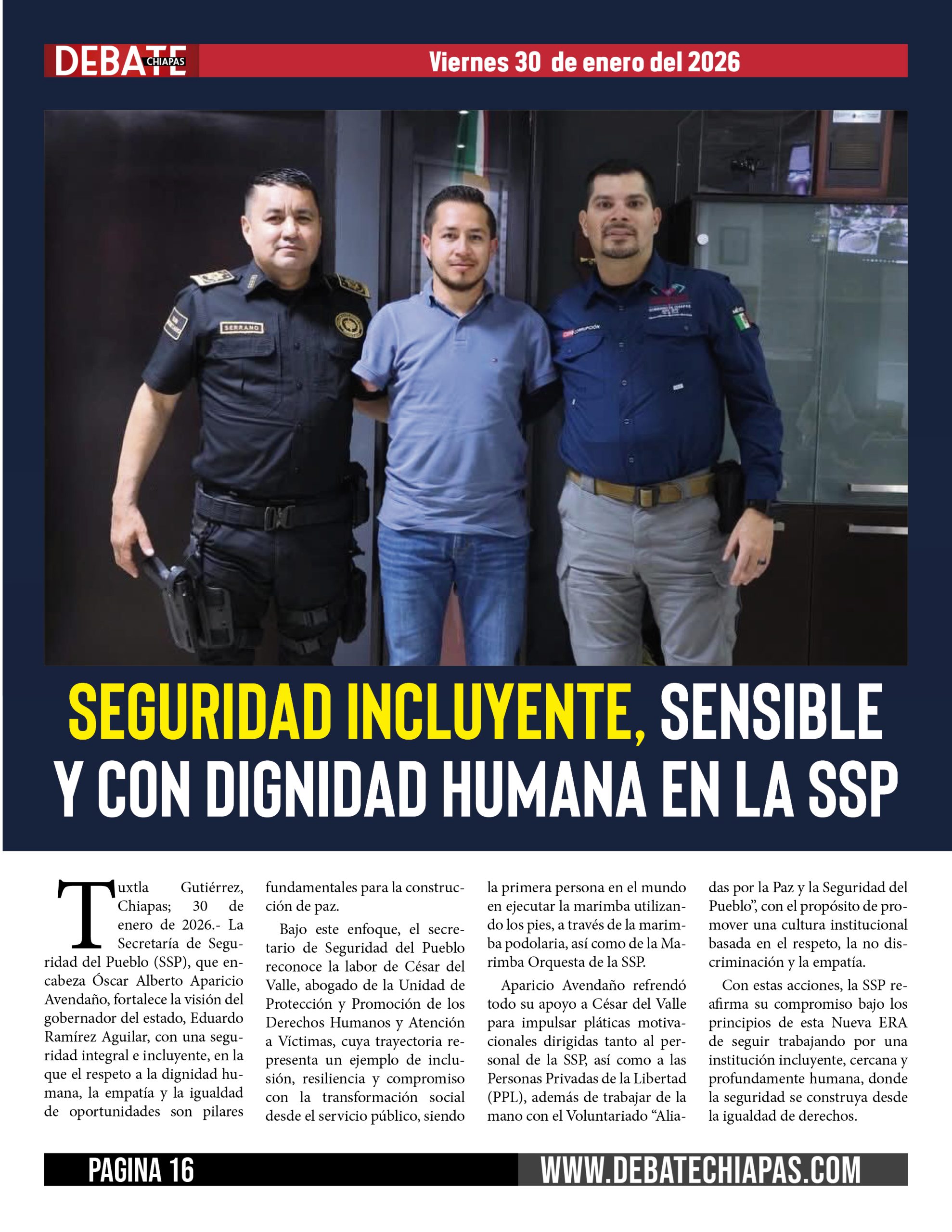 Tuxtla Gutiérrez, Chiapas; 30 de enero de 2026.- La Secretaría de Seguridad del Pueblo (SSP), que encabeza Óscar Alberto Aparicio Avendaño, fortalece la visión del gobernador del estado, Eduardo Ramírez Aguilar, con una seguridad integral e incluyente, en la que el respeto a la dignidad humana, la empatía y la igualdad de oportunidades son pilares fundamentales para la construcción de paz.