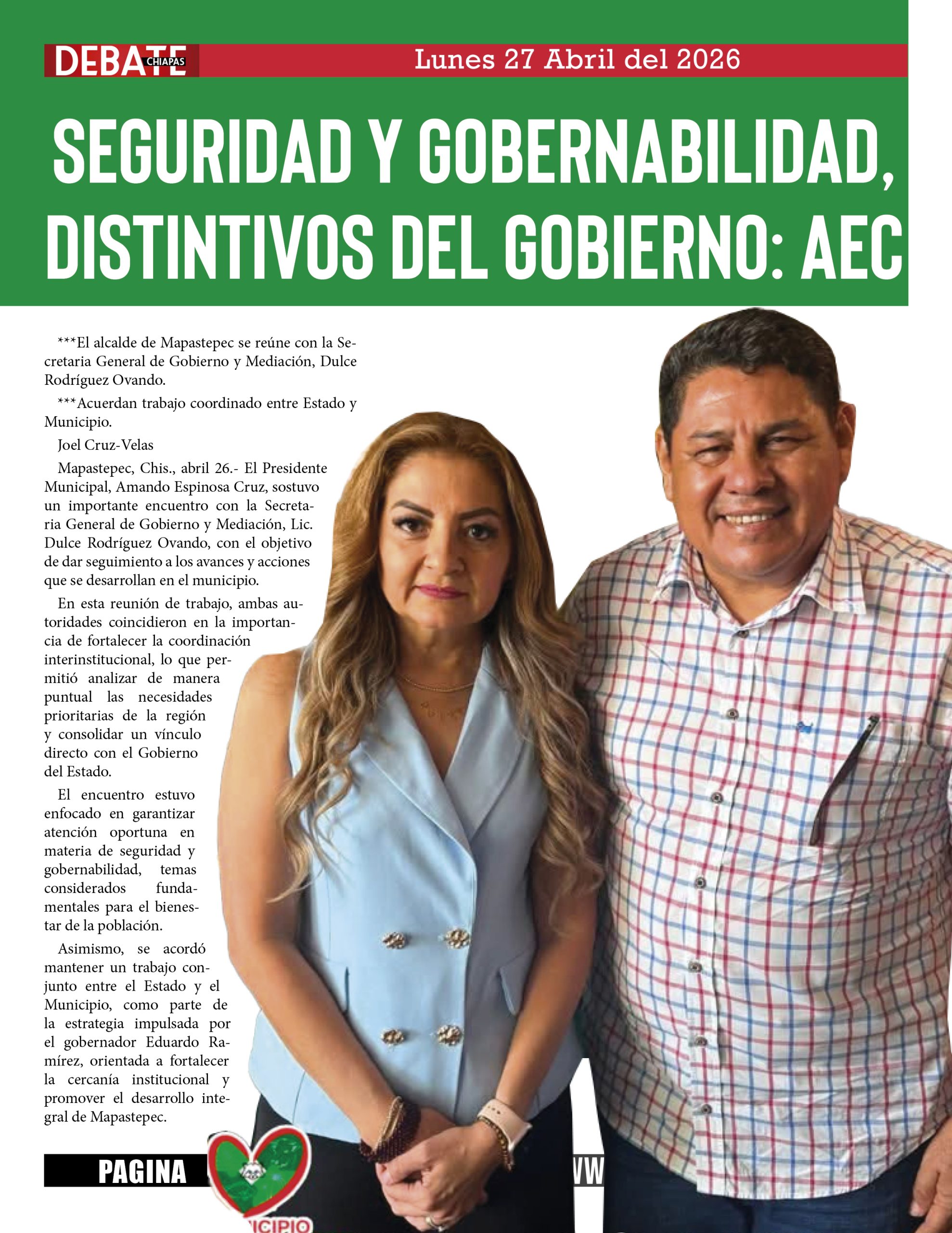 Mapastepec, Chis., abril 26.- El Presidente Municipal, Amando Espinosa Cruz, sostuvo un importante encuentro con la Secretaria General de Gobierno y Mediación, Lic. Dulce Rodríguez Ovando, con el objetivo de dar seguimiento a los avances y acciones que se desarrollan en el municipio.