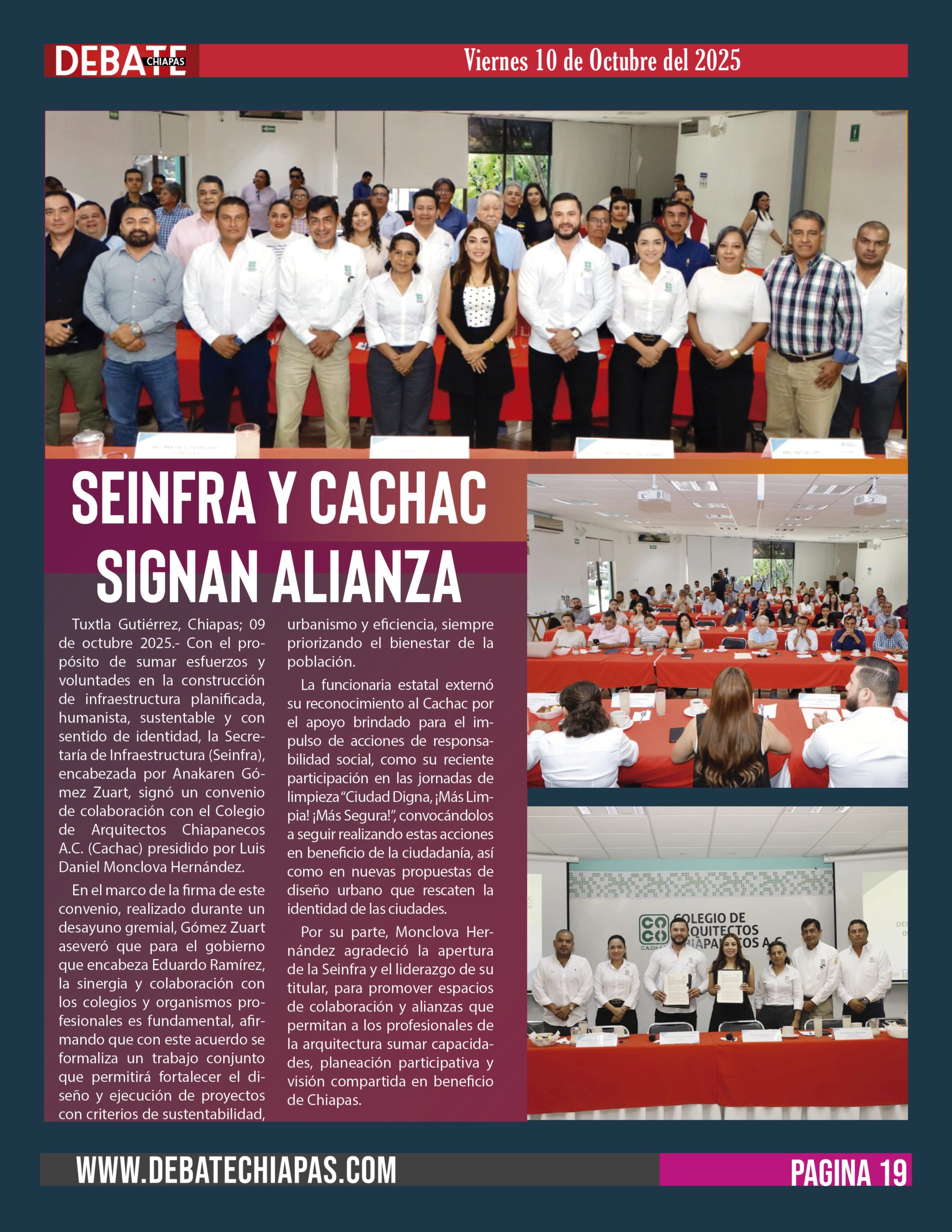 Tuxtla Gutiérrez, Chiapas; 09 de octubre 2025.- Con el propósito de sumar esfuerzos y voluntades en la construcción de infraestructura planificada, humanista, sustentable y con sentido de identidad, la Secretaría de Infraestructura (Seinfra), encabezada por Anakaren Gómez Zuart, signó un convenio de colaboración con el Colegio de Arquitectos Chiapanecos A.C. (Cachac) presidido por Luis Daniel Monclova Hernández.
