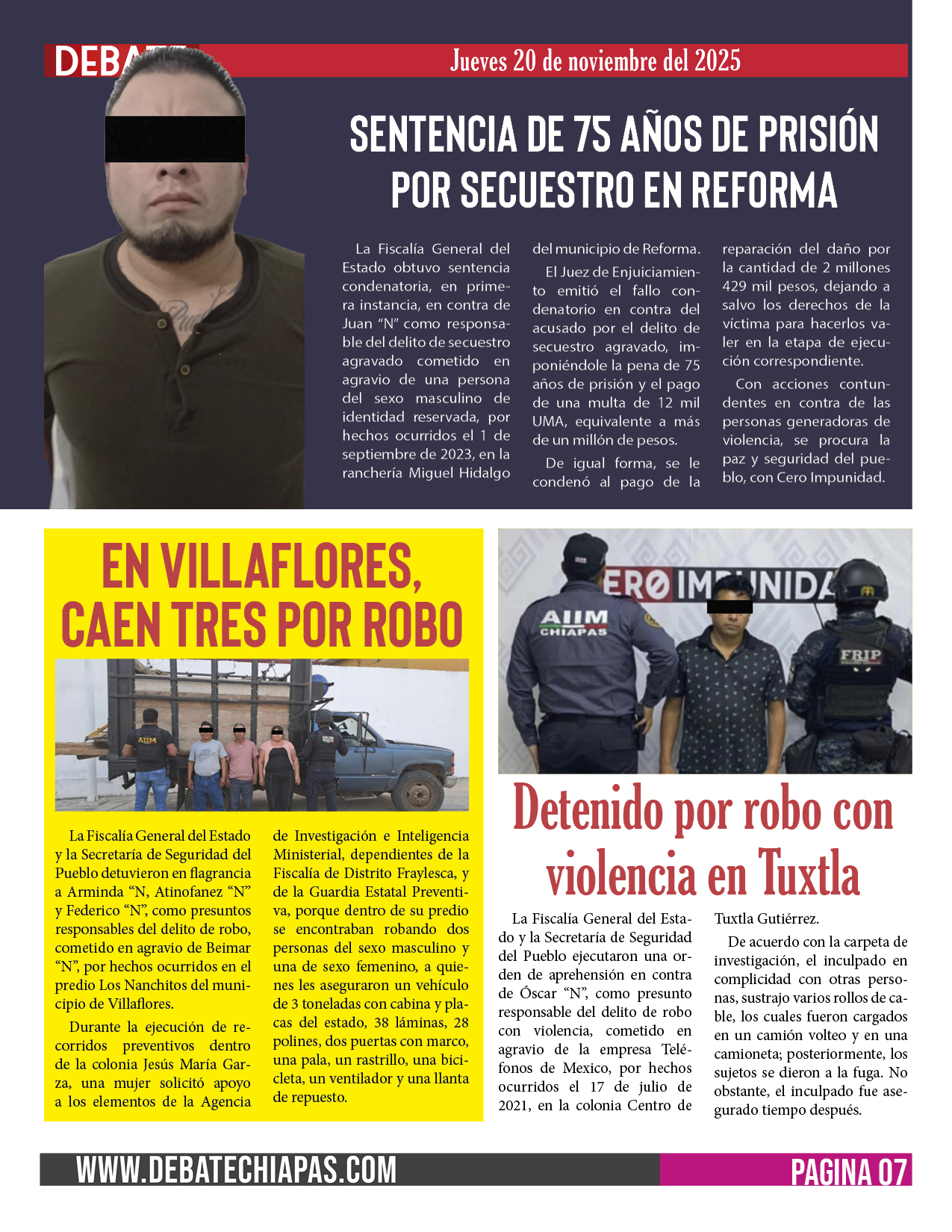 La Fiscalía General del Estado obtuvo sentencia condenatoria, en primera instancia, en contra de Juan “N” como responsable del delito de secuestro agravado cometido en agravio de una persona del sexo masculino de identidad reservada, por hechos ocurridos el 1 de septiembre de 2023, en la ranchería Miguel Hidalgo del municipio de Reforma.