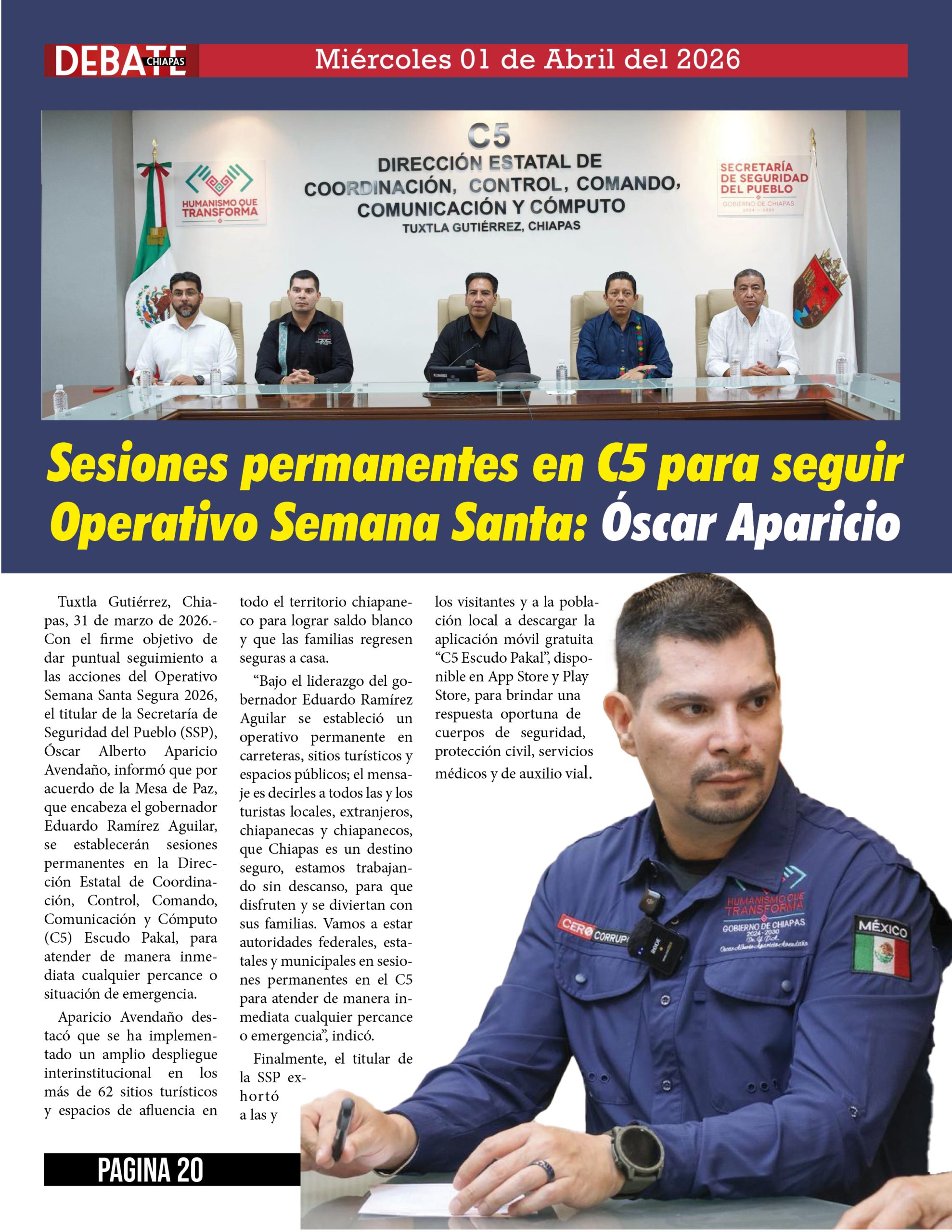 Tuxtla Gutiérrez, Chiapas, 31 de marzo de 2026.- Con el firme objetivo de dar puntual seguimiento a las acciones del Operativo Semana Santa Segura 2026, el titular de la Secretaría de Seguridad del Pueblo (SSP), Óscar Alberto Aparicio Avendaño, informó que por acuerdo de la Mesa de Paz, que encabeza el gobernador Eduardo Ramírez Aguilar, se establecerán sesiones permanentes en la Dirección Estatal de Coordinación, Control, Comando, Comunicación y Cómputo (C5) Escudo Pakal, para atender de manera inmediata cualquier percance o situación de emergencia.