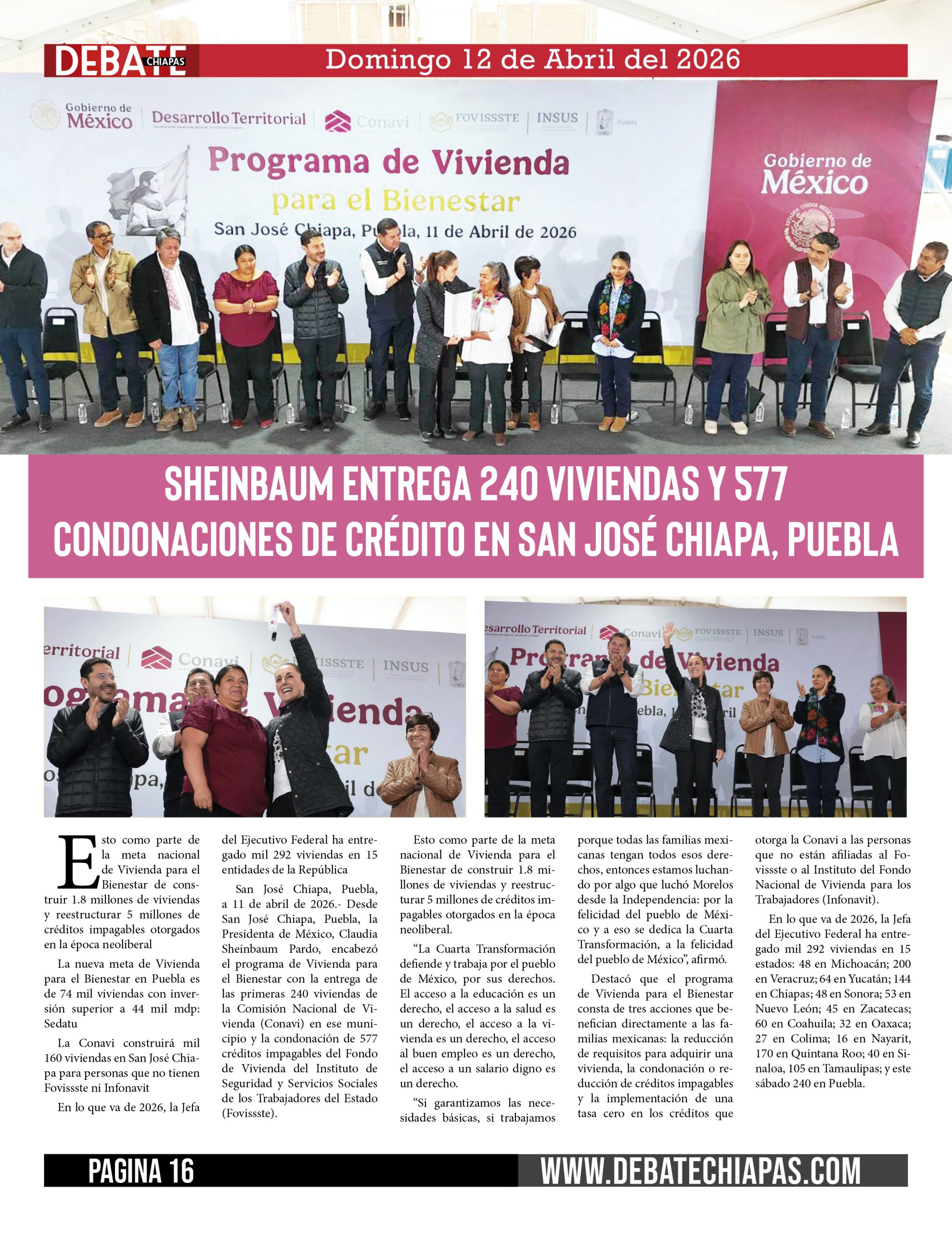 San José Chiapa, Puebla, a 11 de abril de 2026.- Desde San José Chiapa, Puebla, la Presidenta de México, Claudia Sheinbaum Pardo, encabezó el programa de Vivienda para el Bienestar con la entrega de las primeras 240 viviendas de la Comisión Nacional de Vivienda (Conavi) en ese municipio y la condonación de 577 créditos impagables del Fondo de Vivienda del Instituto de Seguridad y Servicios Sociales de los Trabajadores del Estado (Fovissste).