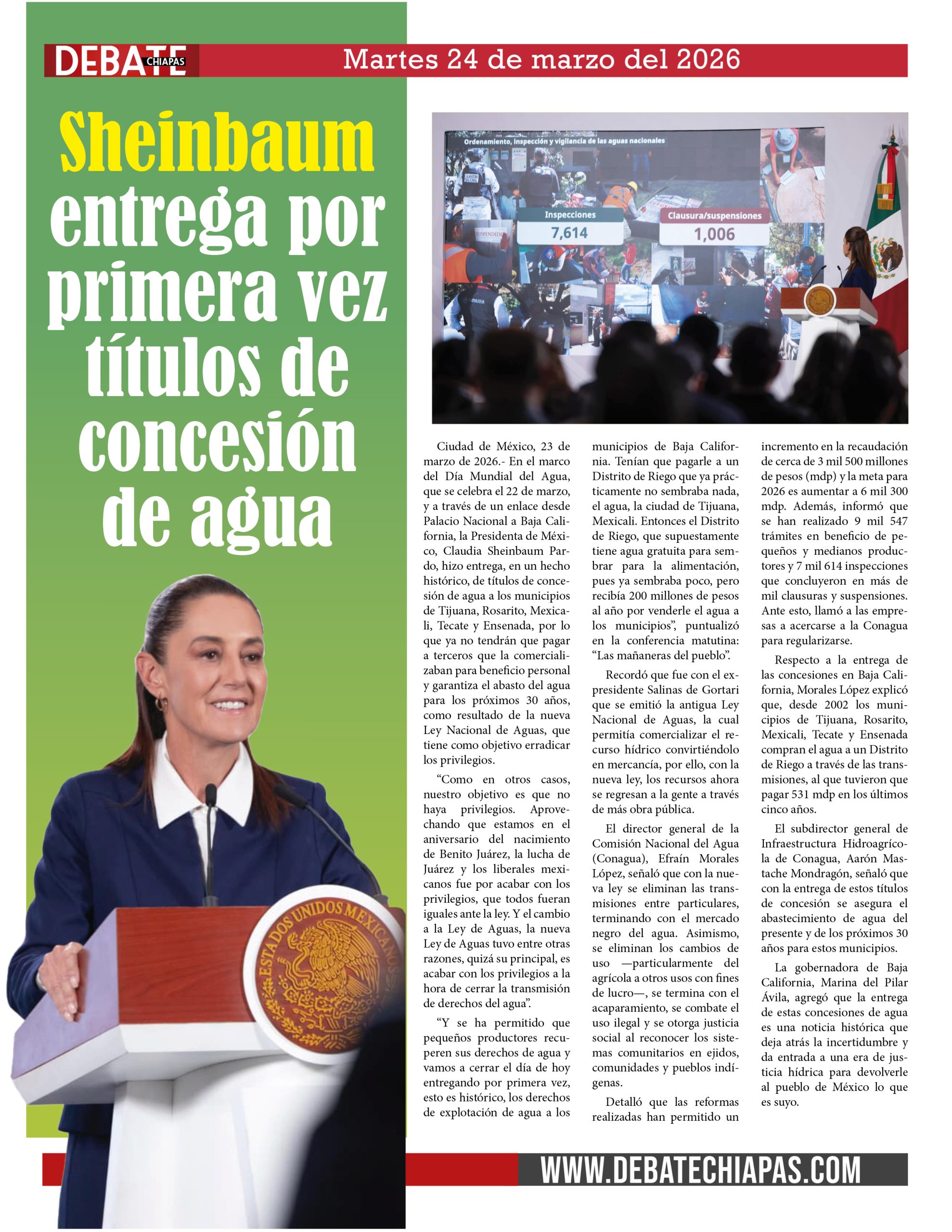 Ciudad de México, 23 de marzo de 2026.- En el marco del Día Mundial del Agua, que se celebra el 22 de marzo, y a través de un enlace desde Palacio Nacional a Baja California, la Presidenta de México, Claudia Sheinbaum Pardo, hizo entrega, en un hecho histórico, de títulos de concesión de agua a los municipios de Tijuana, Rosarito, Mexicali, Tecate y Ensenada, por lo que ya no tendrán que pagar a terceros que la comercializaban para beneficio personal y garantiza el abasto del agua para los próximos 30 años, como resultado de la nueva Ley Nacional de Aguas, que tiene como objetivo erradicar los privilegios.