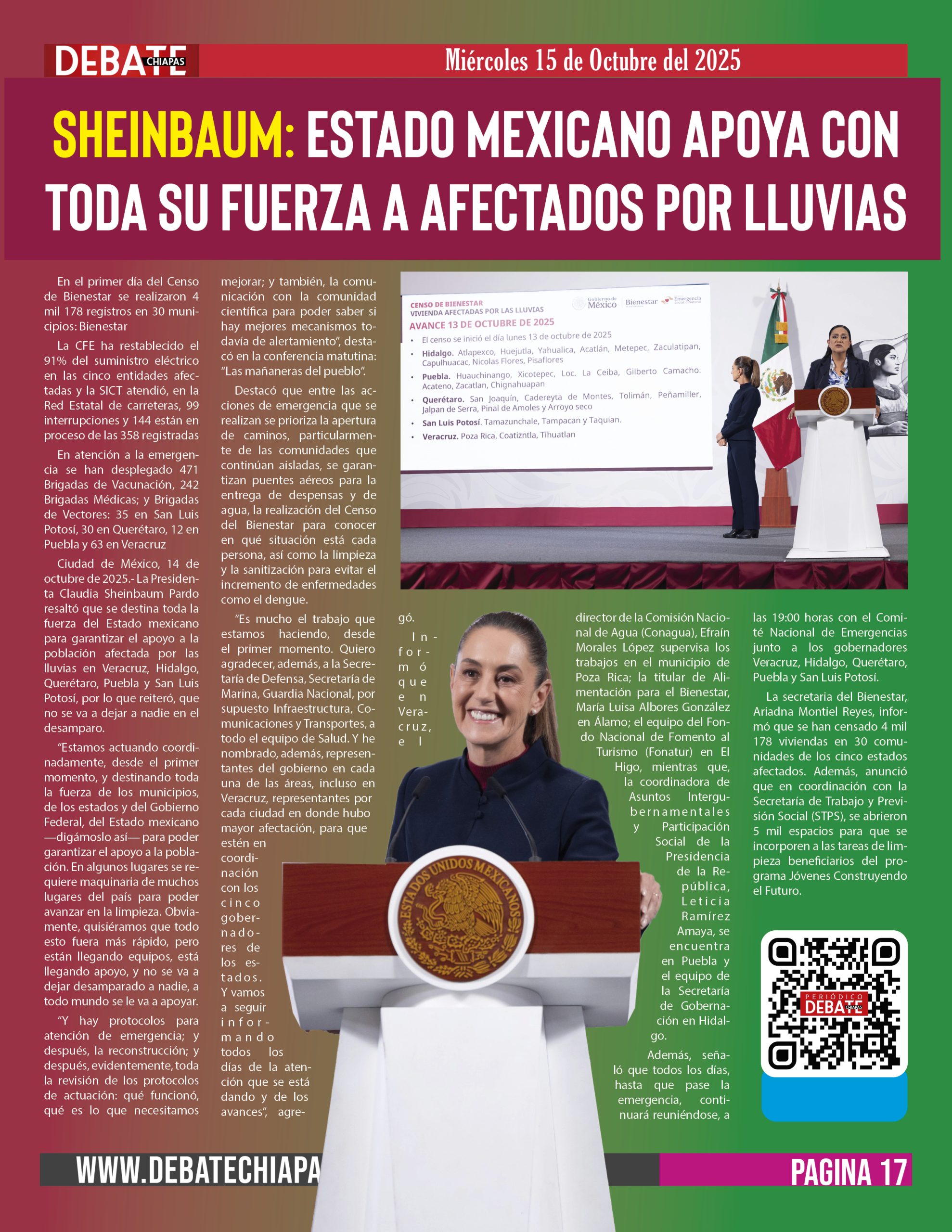 Ciudad de México, 14 de octubre de 2025.- La Presidenta Claudia Sheinbaum Pardo resaltó que se destina toda la fuerza del Estado mexicano para garantizar el apoyo a la población afectada por las lluvias en Veracruz, Hidalgo, Querétaro, Puebla y San Luis Potosí, por lo que reiteró, que no se va a dejar a nadie en el desamparo.