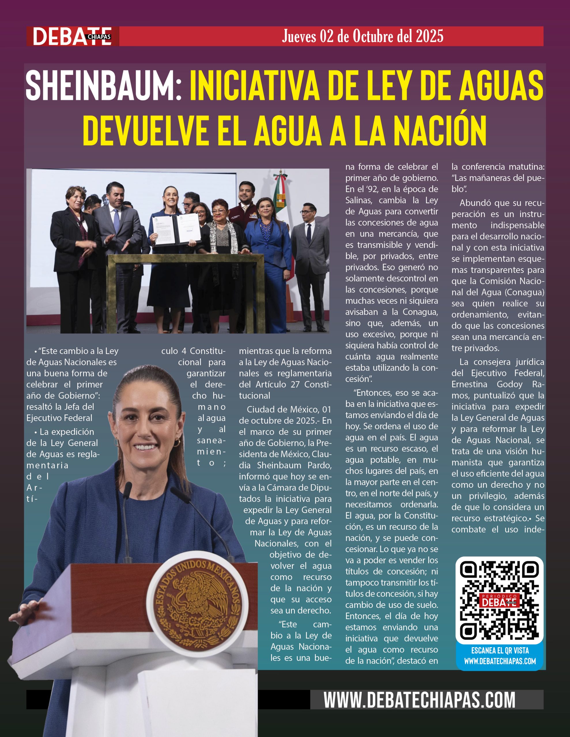 Ciudad de México, 01 de octubre de 2025.- En el marco de su primer año de Gobierno, la Presidenta de México, Claudia Sheinbaum Pardo, informó que hoy se envía a la Cámara de Diputados la iniciativa para expedir la Ley General de Aguas y para reformar la Ley de Aguas Nacionales, con el objetivo de devolver el agua como recurso de la nación y que su acceso sea un derecho.