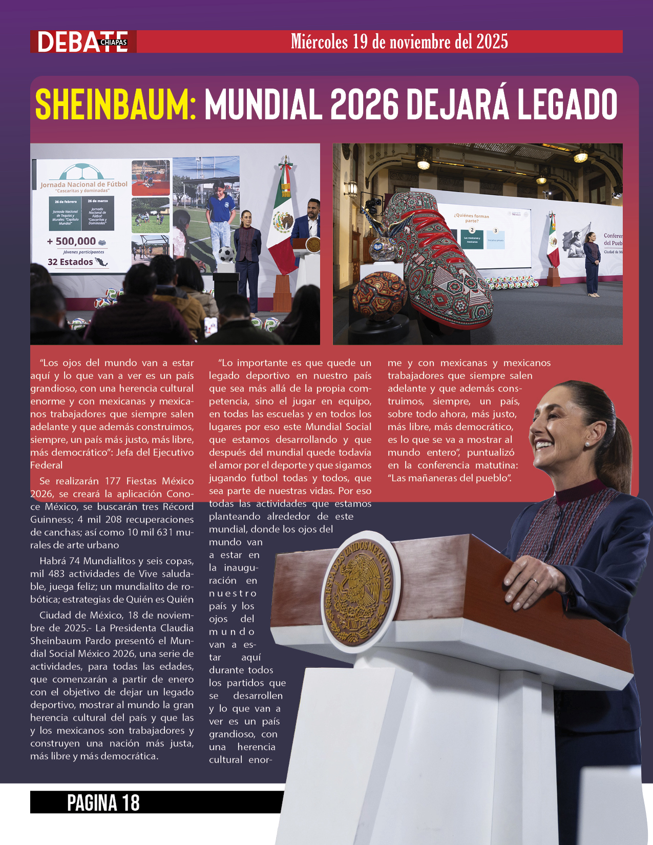 Ciudad de México, 18 de noviembre de 2025.- La Presidenta Claudia Sheinbaum Pardo presentó el Mundial Social México 2026, una serie de actividades, para todas las edades, que comenzarán a partir de enero con el objetivo de dejar un legado deportivo, mostrar al mundo la gran herencia cultural del país y que las y los mexicanos son trabajadores y construyen una nación más justa, más libre y más democrática.