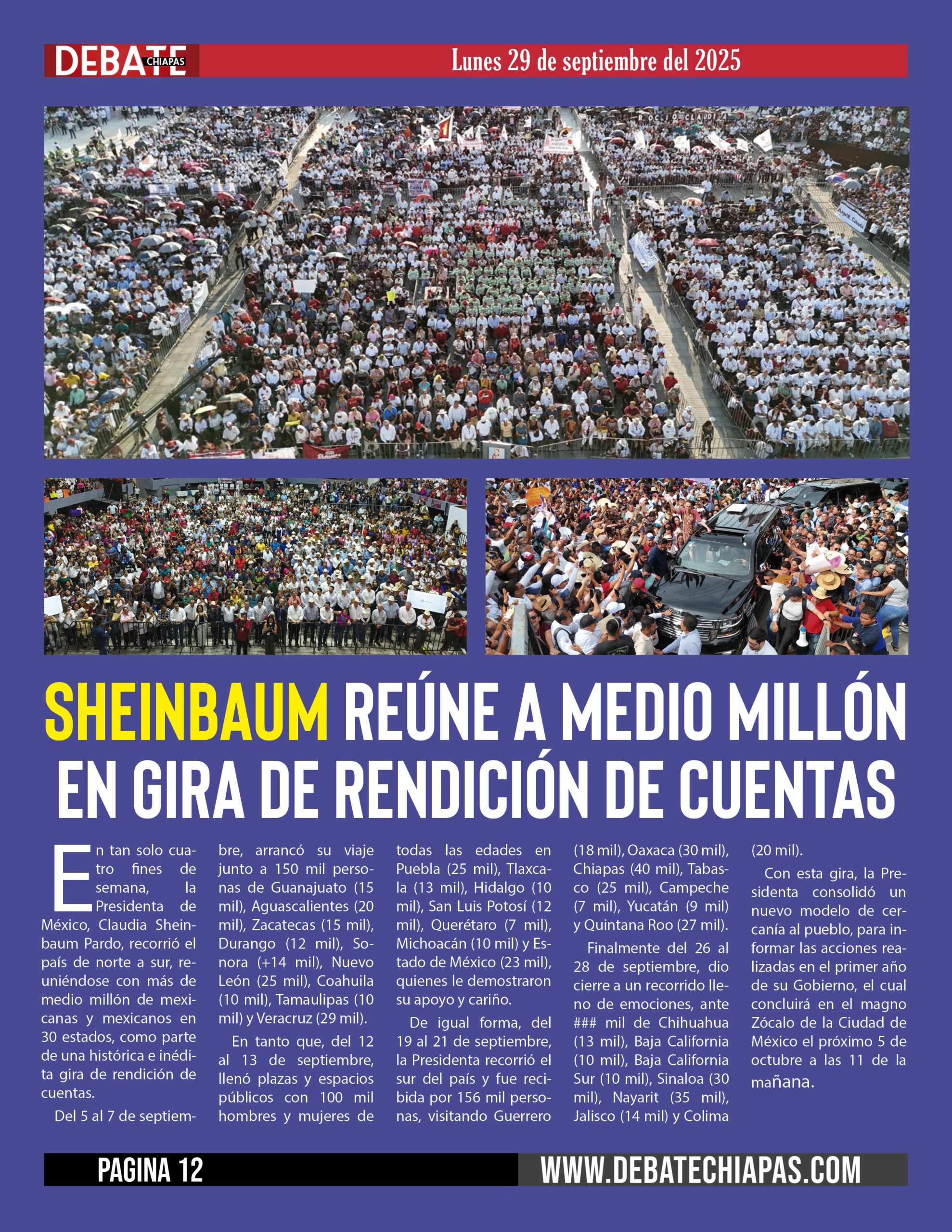 De igual forma, del 19 al 21 de septiembre, la Presidenta recorrió el sur del país y fue recibida por 156 mil personas, visitando Guerrero (18 mil), Oaxaca (30 mil), Chiapas (40 mil), Tabasco (25 mil), Campeche (7 mil), Yucatán (9 mil) y Quintana Roo (27 mil).