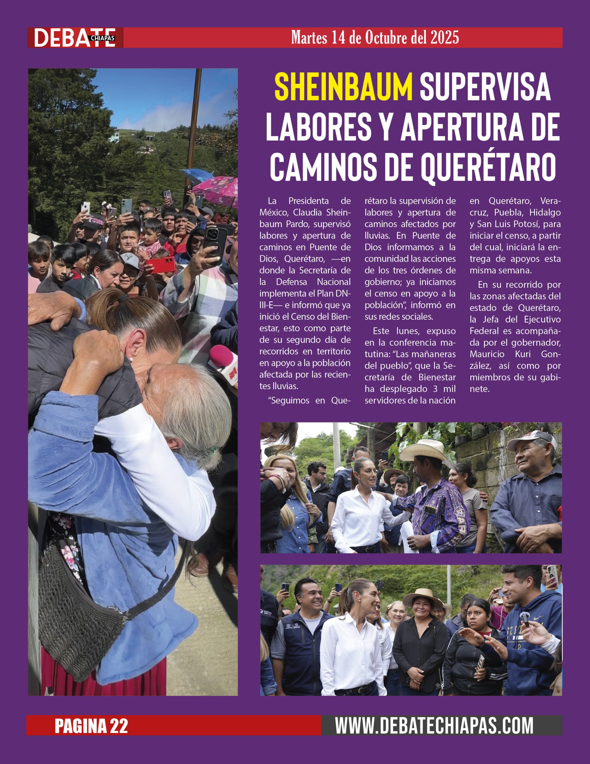 La Presidenta de México, Claudia Sheinbaum Pardo, supervisó labores y apertura de caminos en Puente de Dios, Querétaro, —en donde la Secretaría de la Defensa Nacional implementa el Plan DN-III-E— e informó que ya inició el Censo del Bienestar, esto como parte de su segundo día de recorridos en territorio en apoyo a la población afectada por las recientes lluvias.