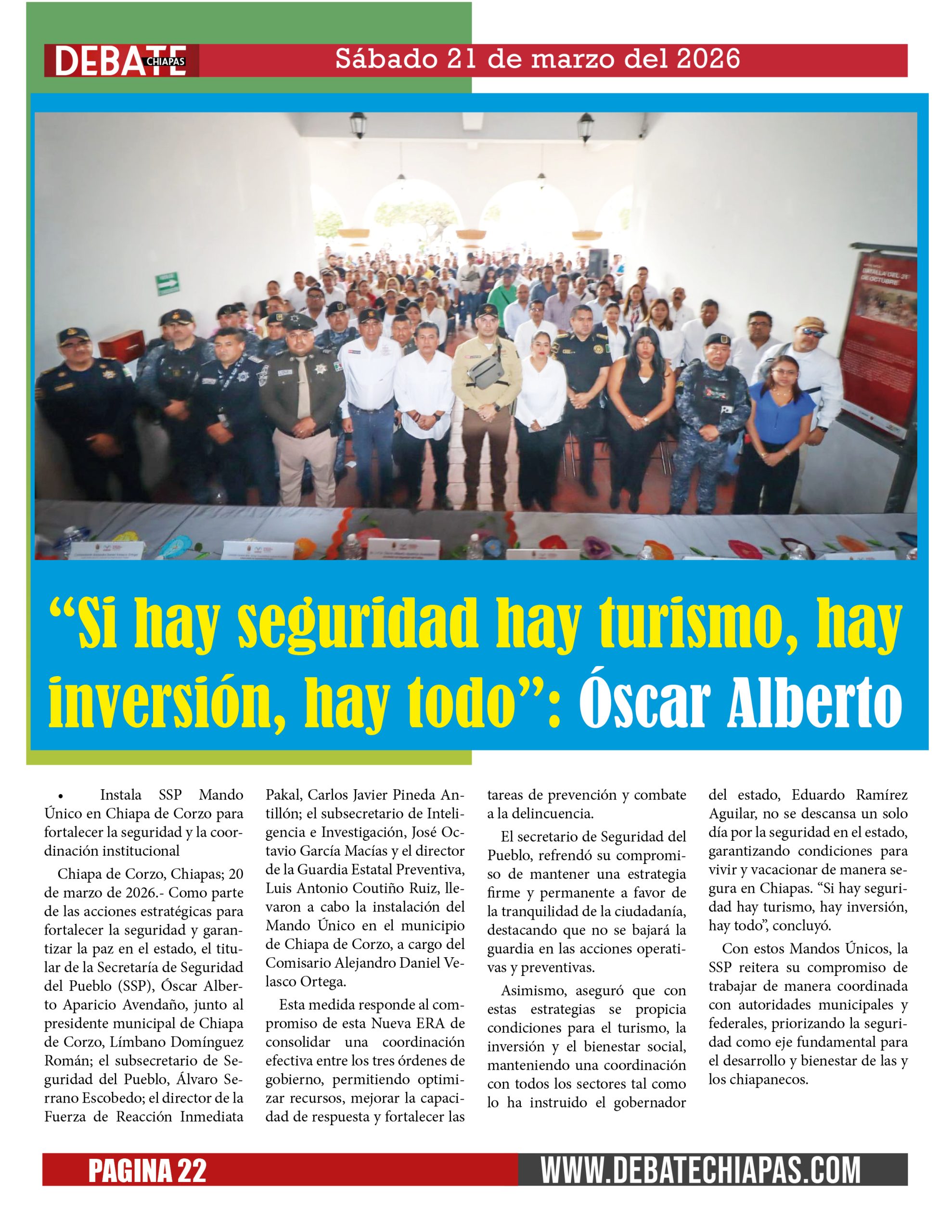 Asimismo, aseguró que con estas estrategias se propicia condiciones para el turismo, la inversión y el bienestar social, manteniendo una coordinación con todos los sectores tal como lo ha instruido el gobernador del estado, Eduardo Ramírez Aguilar, no se descansa un solo día por la seguridad en el estado, garantizando condiciones para vivir y vacacionar de manera segura en Chiapas. “Si hay seguridad hay turismo, hay inversión, hay todo”, concluyó.