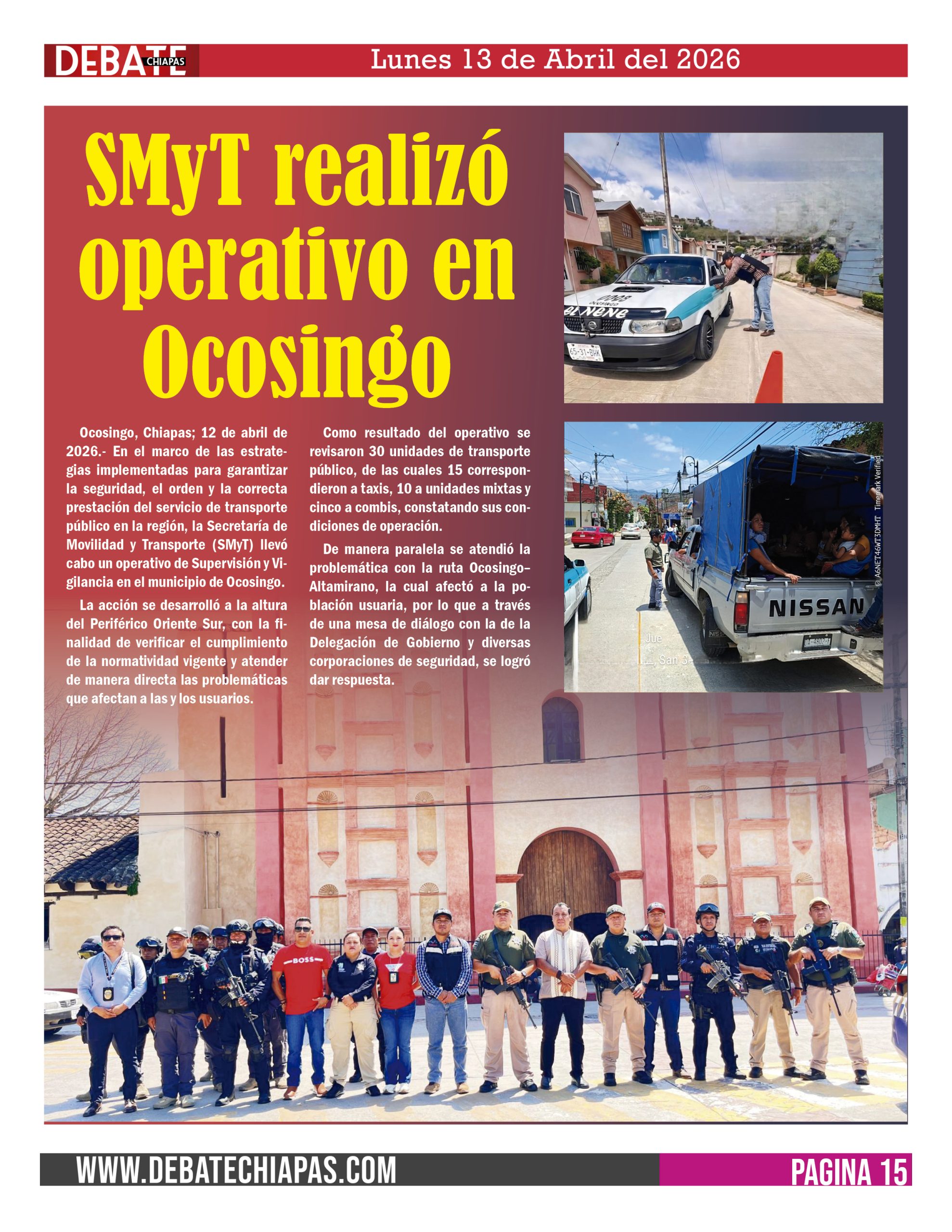 Ocosingo, Chiapas; 12 de abril de 2026.- En el marco de las estrategias implementadas para garantizar la seguridad, el orden y la correcta prestación del servicio de transporte público en la región, la Secretaría de Movilidad y Transporte (SMyT) llevó cabo un operativo de Supervisión y Vigilancia en el municipio de Ocosingo.