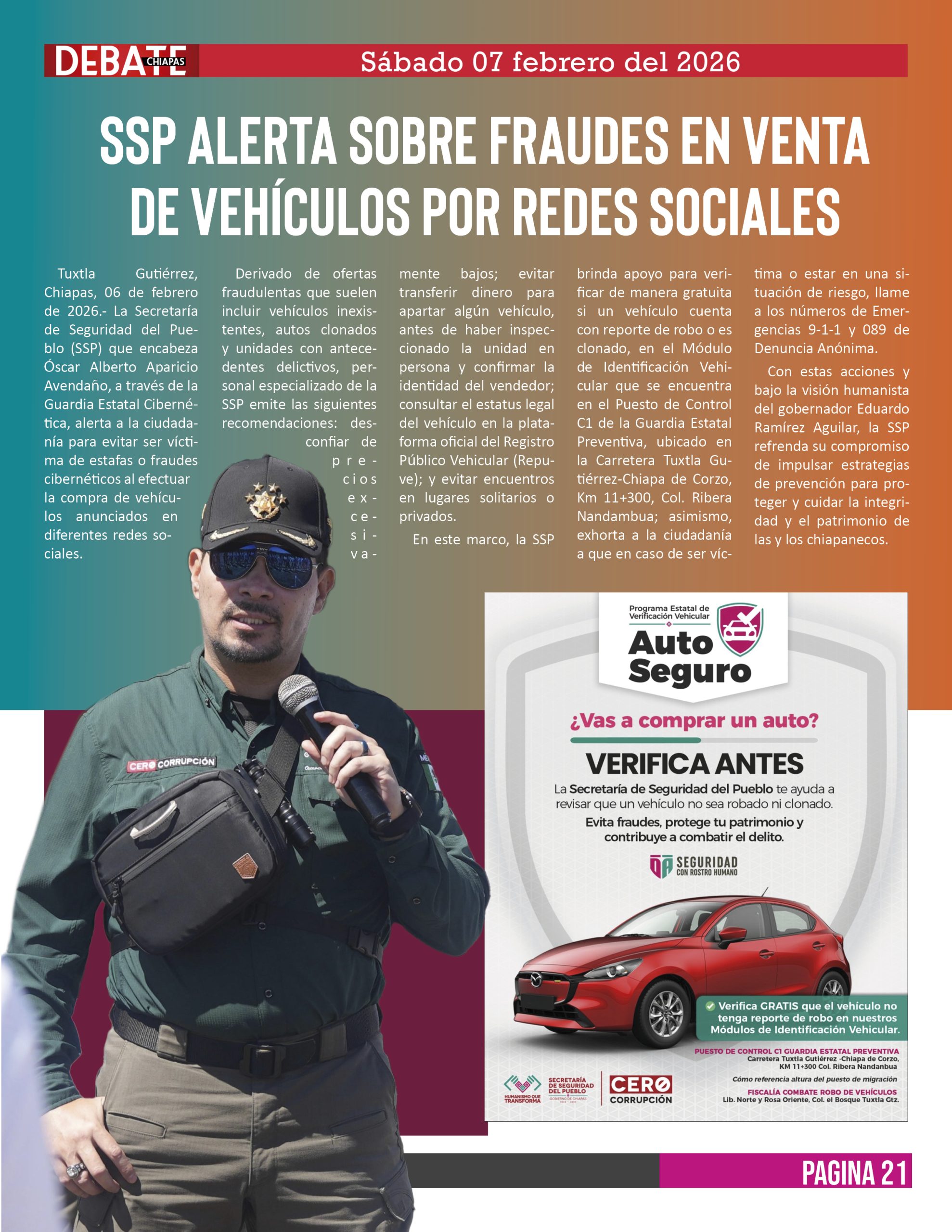 Tuxtla Gutiérrez, Chiapas, 06 de febrero de 2026.- La Secretaría de Seguridad del Pueblo (SSP) que encabeza Óscar Alberto Aparicio Avendaño, a través de la Guardia Estatal Cibernética, alerta a la ciudadanía para evitar ser víctima de estafas o fraudes cibernéticos al efectuar la compra de vehículos anunciados en diferentes redes sociales.