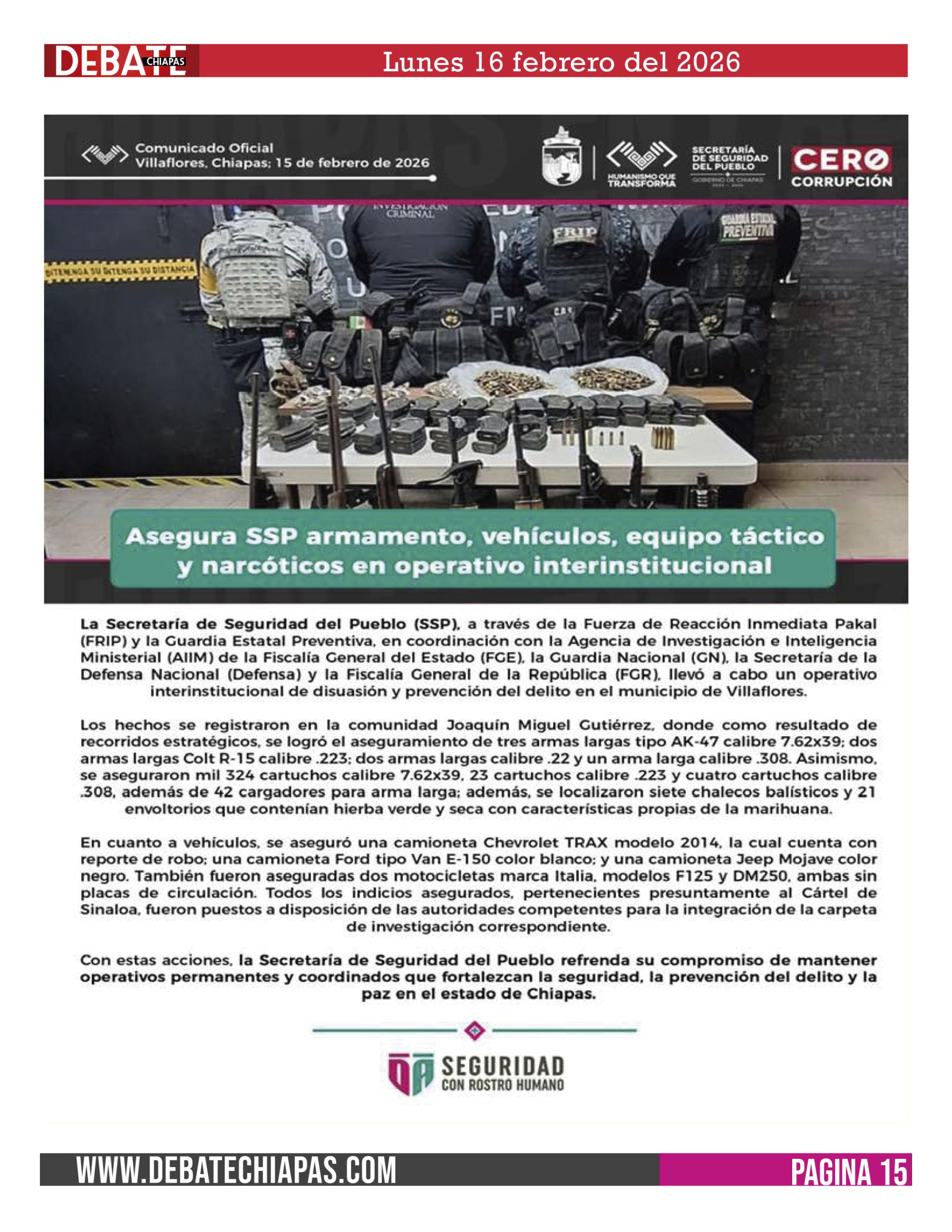 La Secretaría de Seguridad del Pueblo (SSP), a través de la Fuerza de Reacción Inmediata Pakal (FRIP) y la Guardia Estatal Preventiva, en coordinación con la Agencia de Investigación e Inteligencia