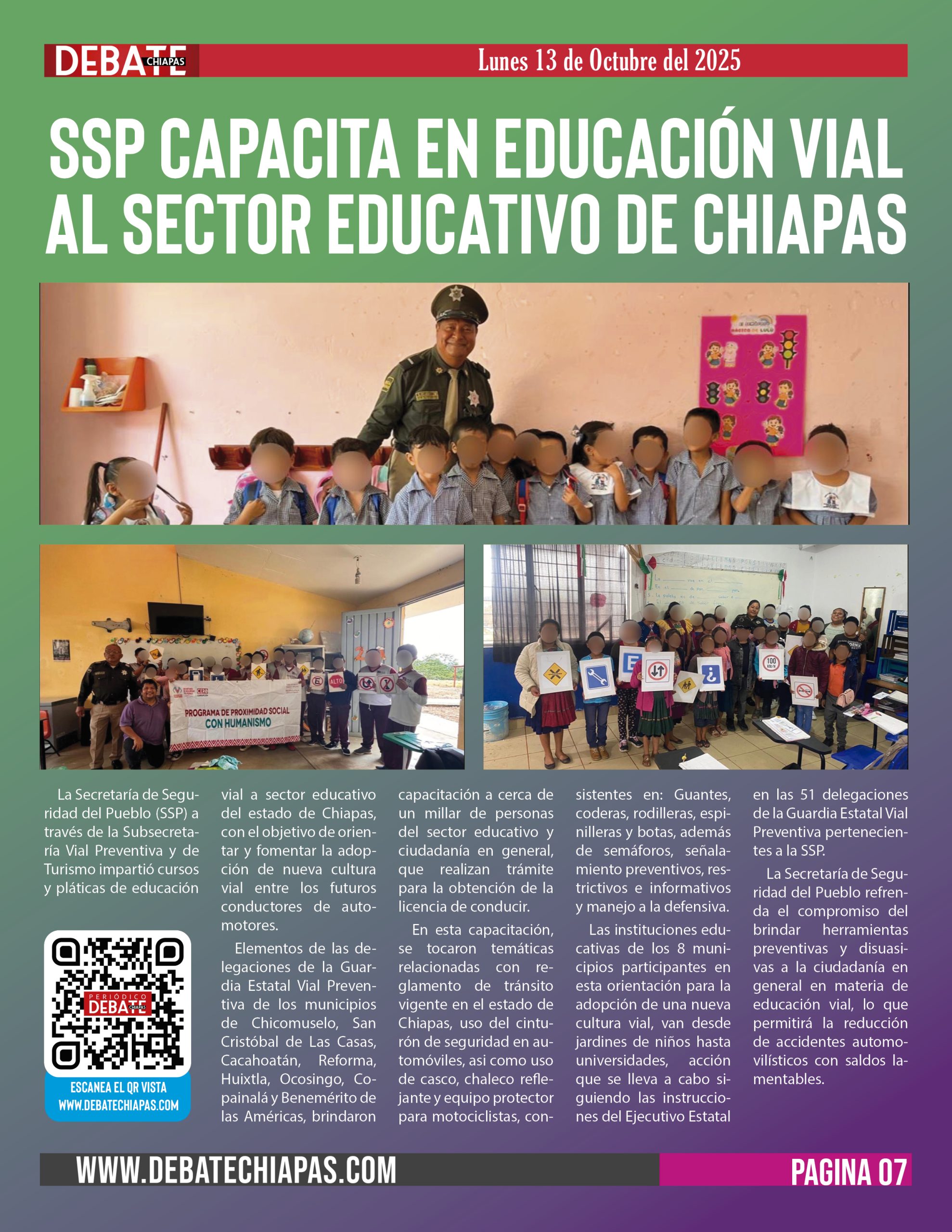 La Secretaría de Seguridad del Pueblo (SSP) a través de la Subsecretaría Vial Preventiva y de Turismo impartió cursos y pláticas de educación vial a sector educativo del estado de Chiapas, con el objetivo de orientar y fomentar la adopción de nueva cultura vial entre los futuros conductores de automotores.
