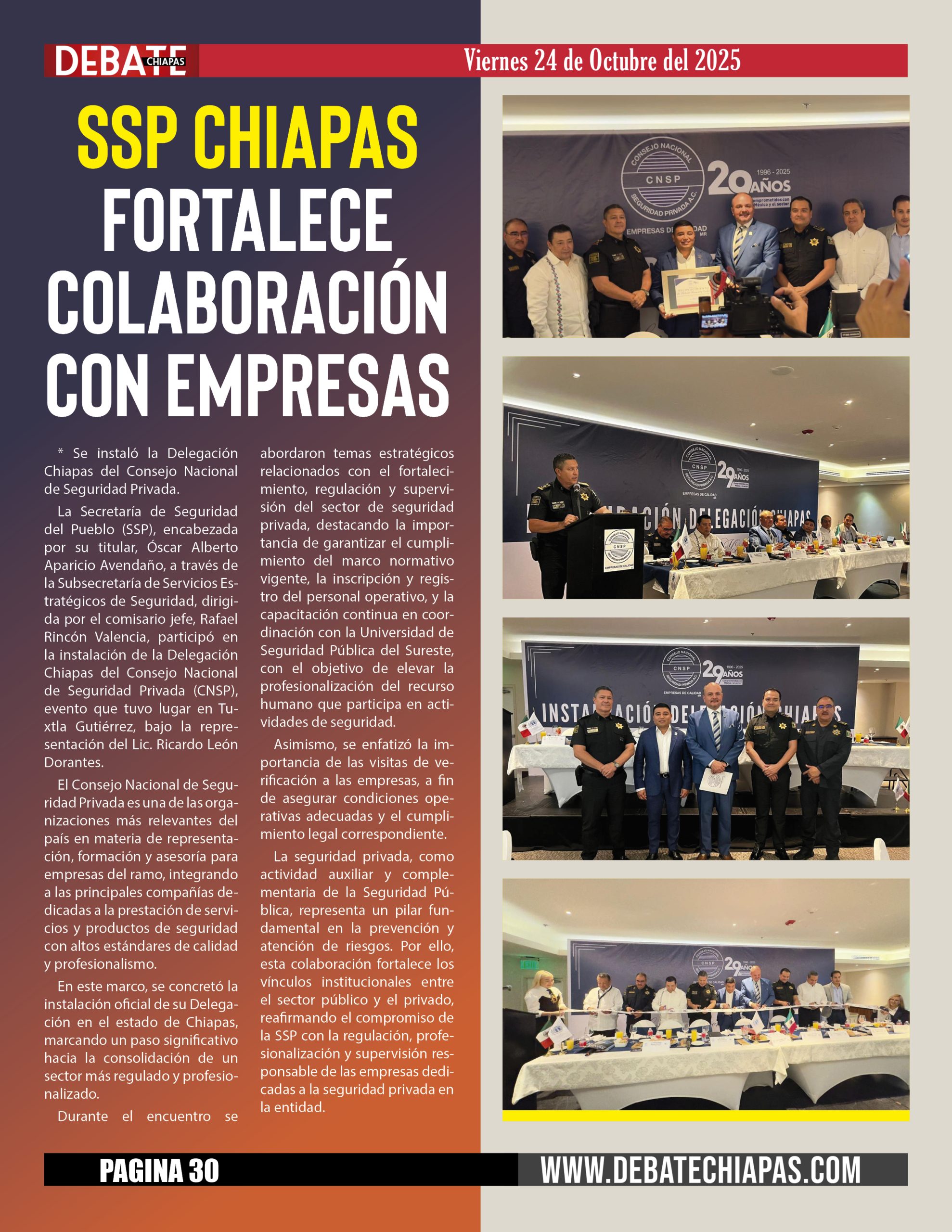 La Secretaría de Seguridad del Pueblo (SSP), encabezada por su titular, Óscar Alberto Aparicio Avendaño, a través de la Subsecretaría de Servicios Estratégicos de Seguridad, dirigida por el comisario jefe, Rafael Rincón Valencia, participó en la instalación de la Delegación Chiapas del Consejo Nacional de Seguridad Privada (CNSP), evento que tuvo lugar en Tuxtla Gutiérrez, bajo la representación del Lic. Ricardo León Dorantes.