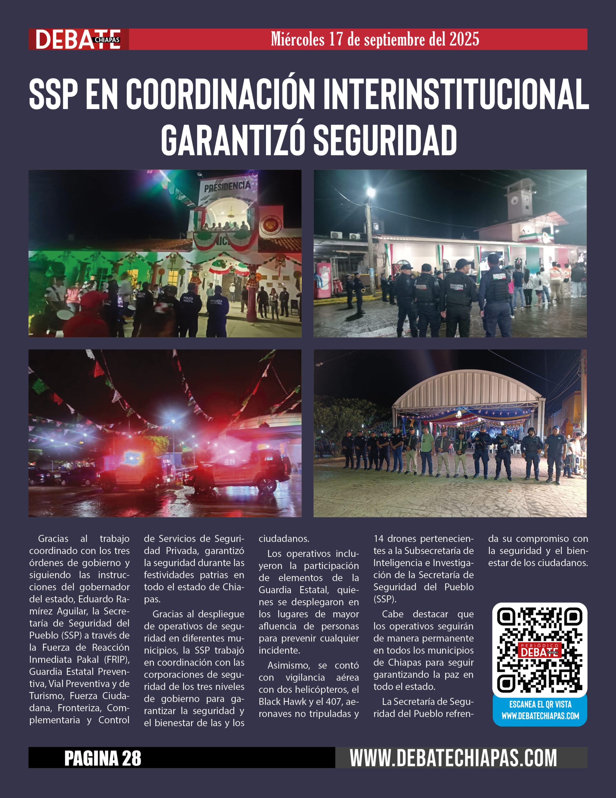 Gracias al trabajo coordinado con los tres órdenes de gobierno y siguiendo las instrucciones del gobernador del estado, Eduardo Ramírez Aguilar, la Secretaría de Seguridad del Pueblo (SSP) a través de la Fuerza de Reacción Inmediata Pakal (FRIP), Guardia Estatal Preventiva, Vial Preventiva y de Turismo, Fuerza Ciudadana, Fronteriza, Complementaria y Control de Servicios de Seguridad Privada, garantizó la seguridad durante las festividades patrias en todo el estado de Chiapas.