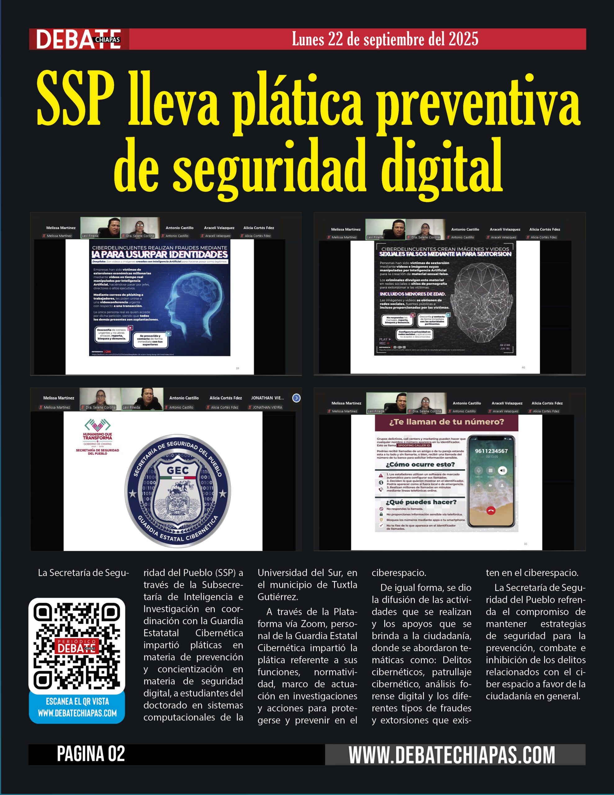 La Secretaría de Seguridad del Pueblo (SSP) a través de la Subsecretaría de Inteligencia e Investigación en coordinación con la Guardia Estatatal Cibernética impartió pláticas en materia de prevención y concientización en materia de seguridad digital, a estudiantes del doctorado en sistemas computacionales de la Universidad del Sur, en el municipio de Tuxtla Gutiérrez.