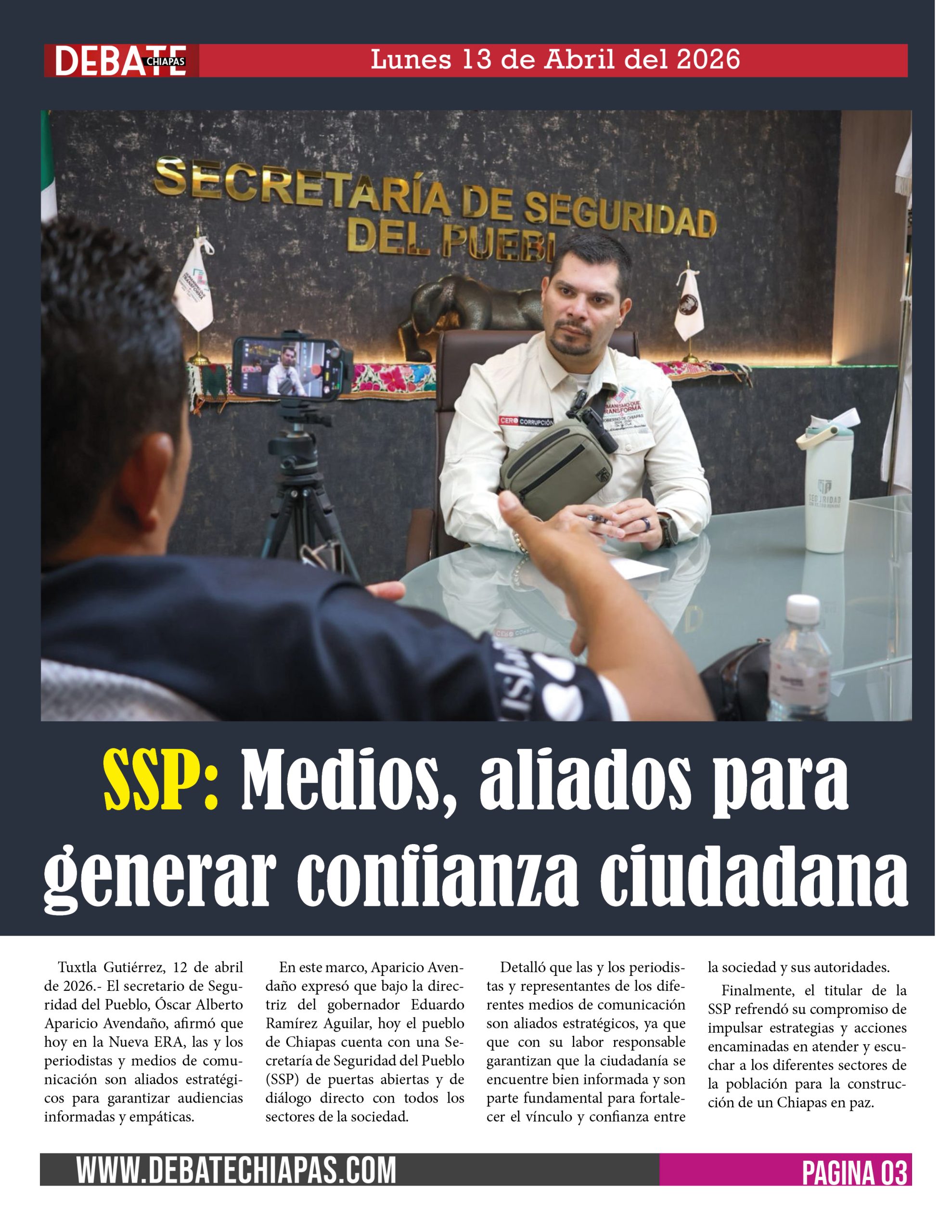 Tuxtla Gutiérrez, 12 de abril de 2026.- El secretario de Seguridad del Pueblo, Óscar Alberto Aparicio Avendaño, afirmó que hoy en la Nueva ERA, las y los periodistas y medios de comunicación son aliados estratégicos para garantizar audiencias informadas y empáticas.