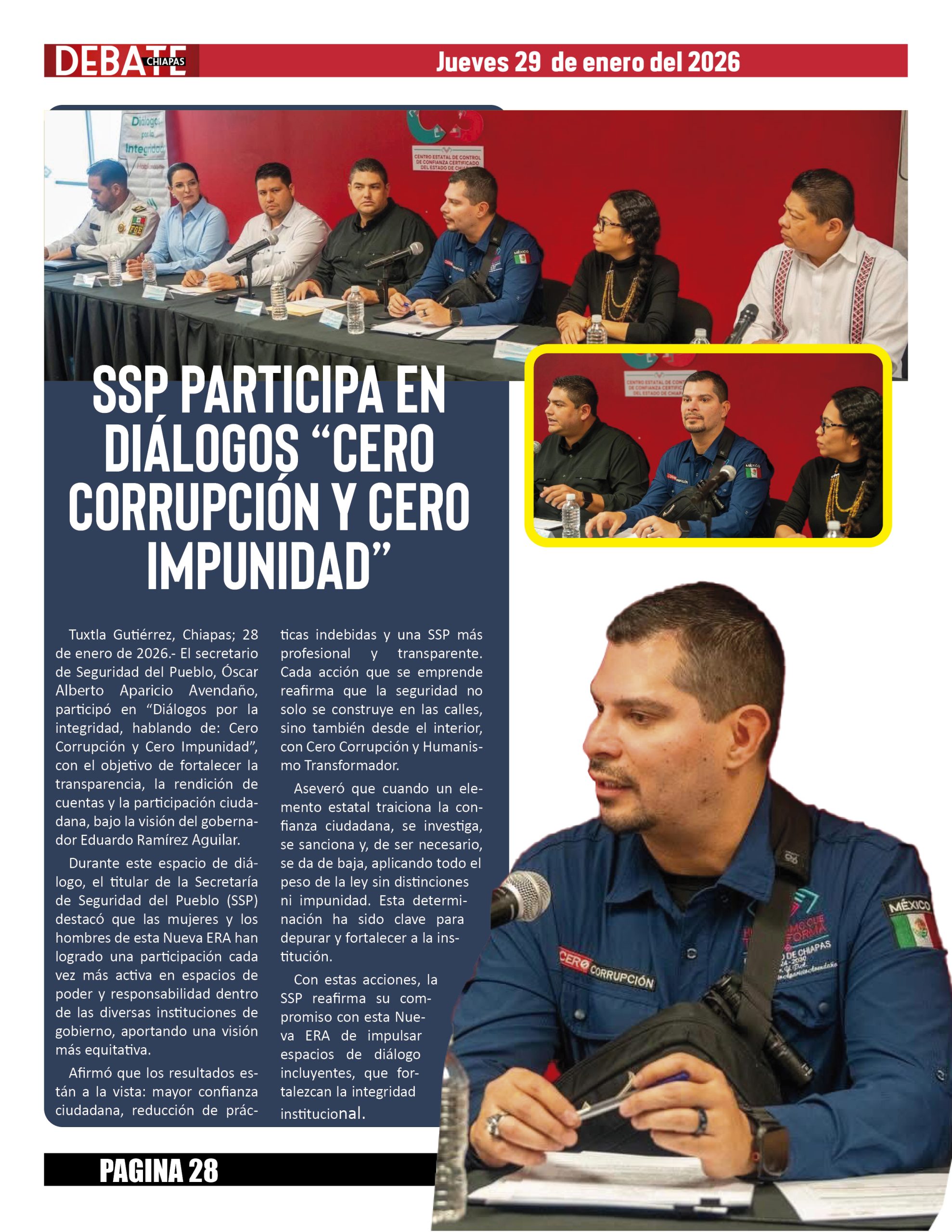 Tuxtla Gutiérrez, Chiapas; 28 de enero de 2026.- El secretario de Seguridad del Pueblo, Óscar Alberto Aparicio Avendaño, participó en “Diálogos por la integridad, hablando de: Cero Corrupción y Cero Impunidad”, con el objetivo de fortalecer la transparencia, la rendición de cuentas y la participación ciudadana, bajo la visión del gobernador Eduardo Ramírez Aguilar.