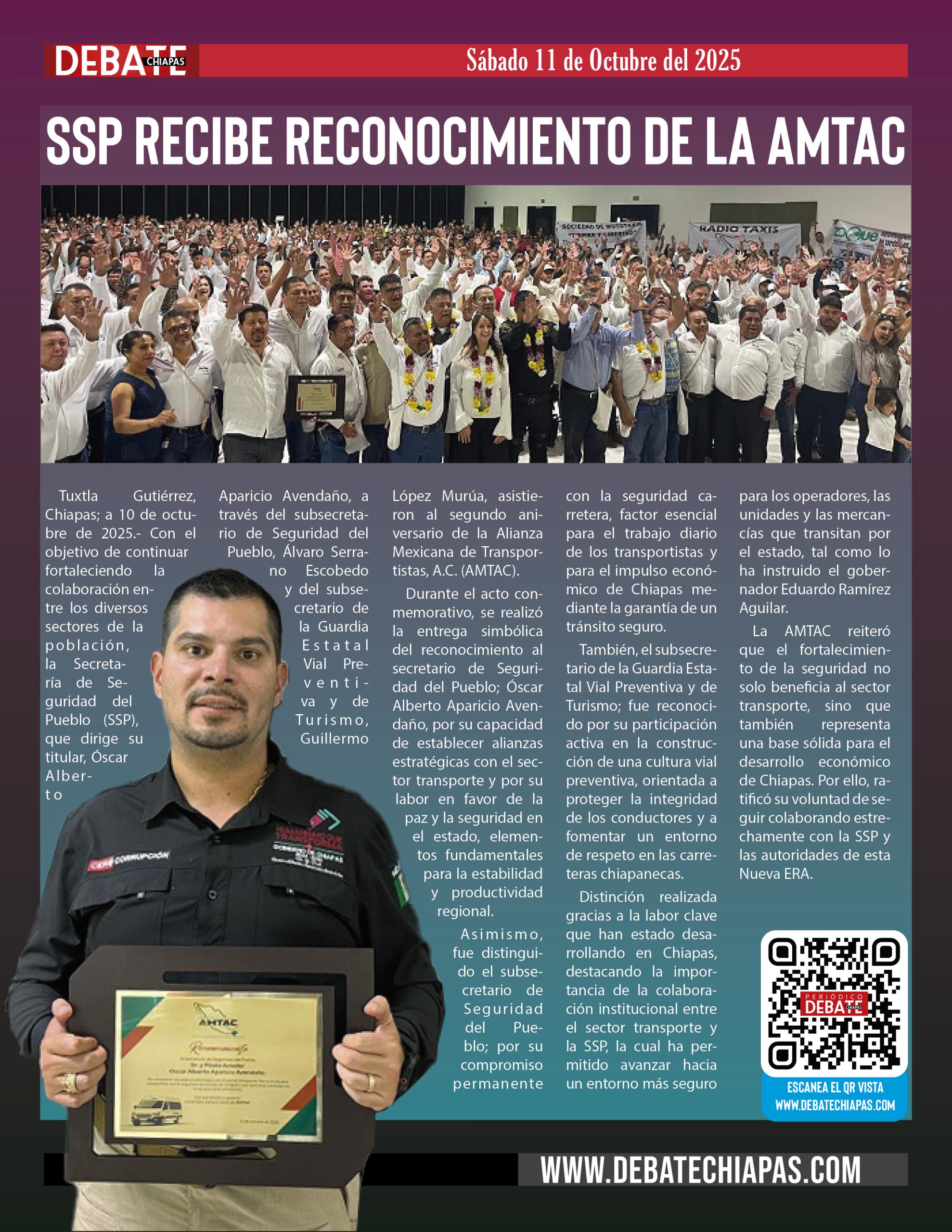Tuxtla Gutiérrez, Chiapas; a 10 de octubre de 2025.- Con el objetivo de continuar fortaleciendo la colaboración entre los diversos sectores de la población, la Secretaría de Seguridad del Pueblo (SSP), que dirige su titular, Óscar Alberto Aparicio Avendaño, a través del subsecretario de Seguridad del Pueblo, Álvaro Serrano Escobedo y del subsecretario de la Guardia Estatal Vial Preventiva y de Turismo, Guillermo López Murúa, asistieron al segundo aniversario de la Alianza Mexicana de Transportistas, A.C. (AMTAC).