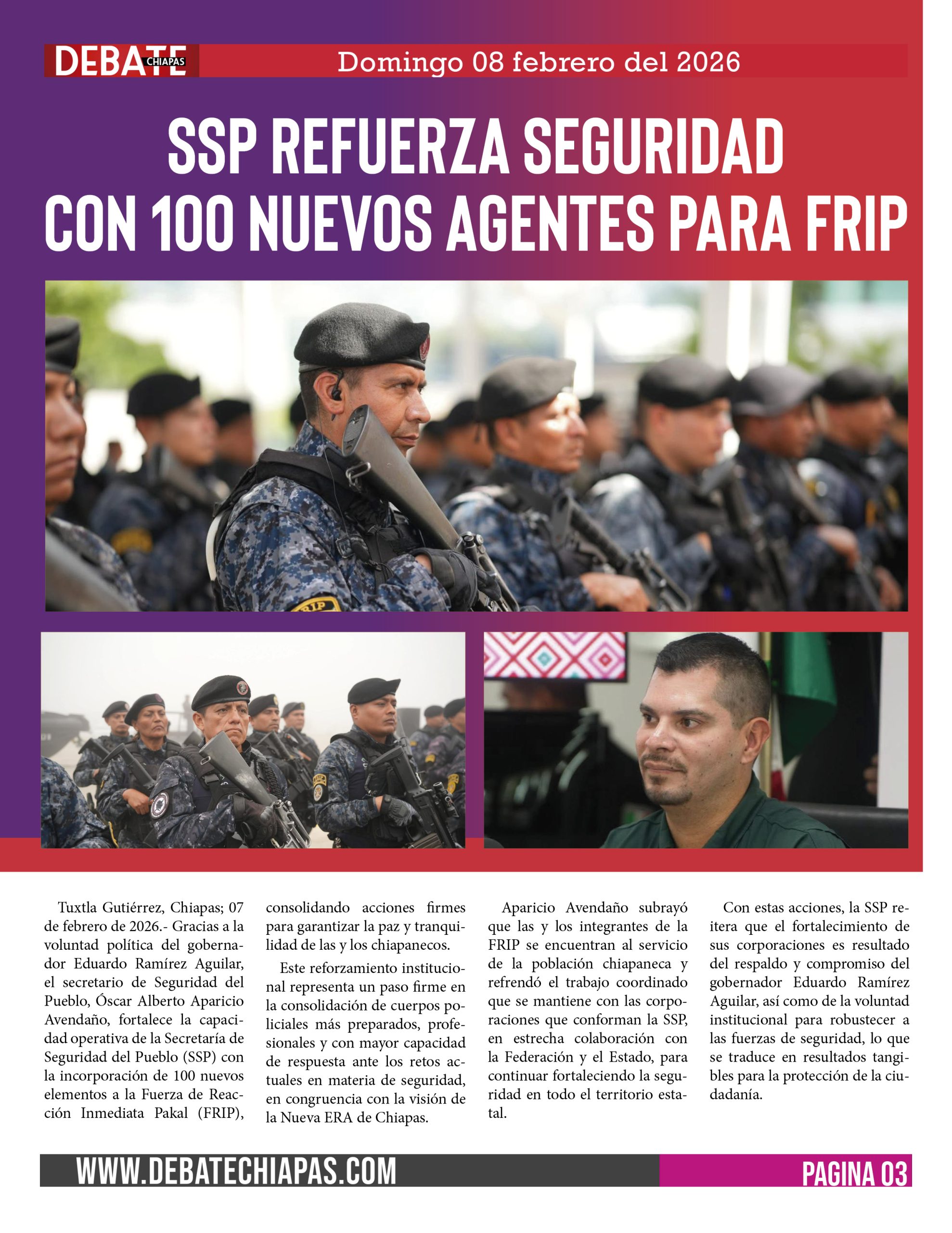 Tuxtla Gutiérrez, Chiapas; 07 de febrero de 2026.- Gracias a la voluntad política del gobernador Eduardo Ramírez Aguilar, el secretario de Seguridad del Pueblo, Óscar Alberto Aparicio Avendaño, fortalece la capacidad operativa de la Secretaría de Seguridad del Pueblo (SSP) con la incorporación de 100 nuevos elementos a la Fuerza de Reacción Inmediata Pakal (FRIP), consolidando acciones firmes para garantizar la paz y tranquilidad de las y los chiapanecos.