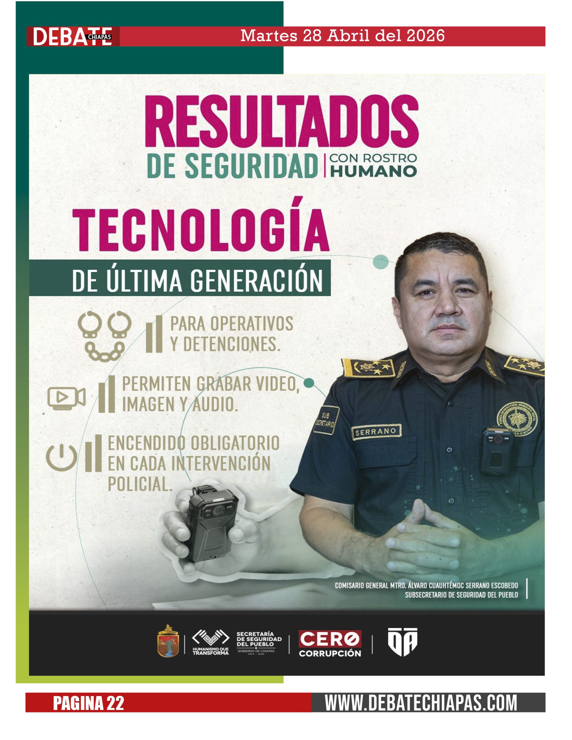 Tuxtla Gutiérrez, Chiapas; 27 de abril de 2026.- En la Nueva ERA de seguridad en Chiapas, los elementos de la Secretaría de Seguridad del Pueblo (SSP) que encabeza Óscar Alberto Aparicio Avendaño, hoy cuentan con mil 250 cámaras de solapa; una herramienta de última generación que permite legitimar sus intervenciones durante operativos de alto impacto y detenciones.