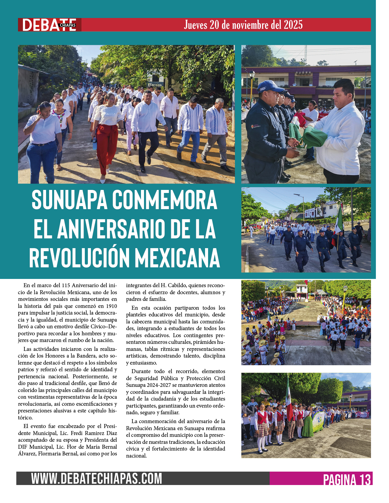 En el marco del 115 Aniversario del inicio de la Revolución Mexicana, uno de los movimientos sociales más importantes en la historia del país que comenzó en 1910 para impulsar la justicia social, la democracia y la igualdad, el municipio de Sunuapa llevó a cabo un emotivo desfile Cívico–Deportivo para recordar a los hombres y mujeres que marcaron el rumbo de la nación.