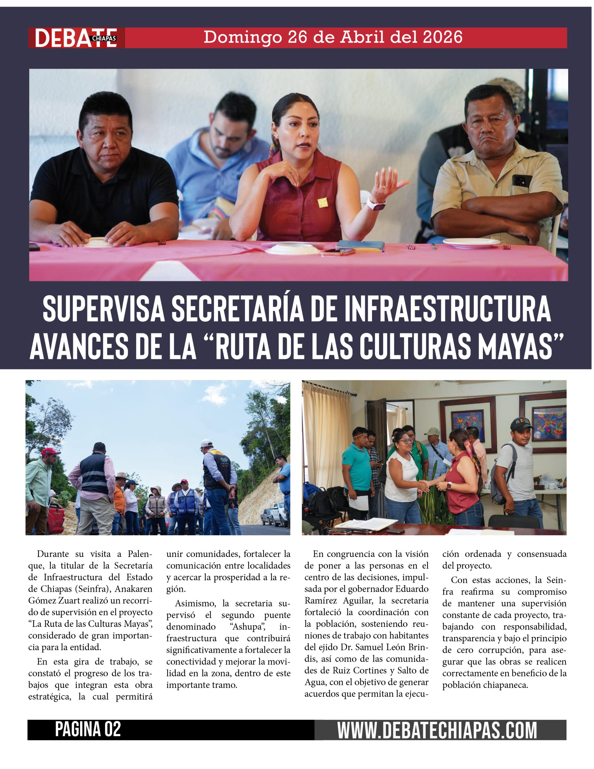 Durante su visita a Palenque, la titular de la Secretaría de Infraestructura del Estado de Chiapas (Seinfra), Anakaren Gómez Zuart realizó un recorrido de supervisión en el proyecto “La Ruta de las Culturas Mayas”, considerado de gran importancia para la entidad.
