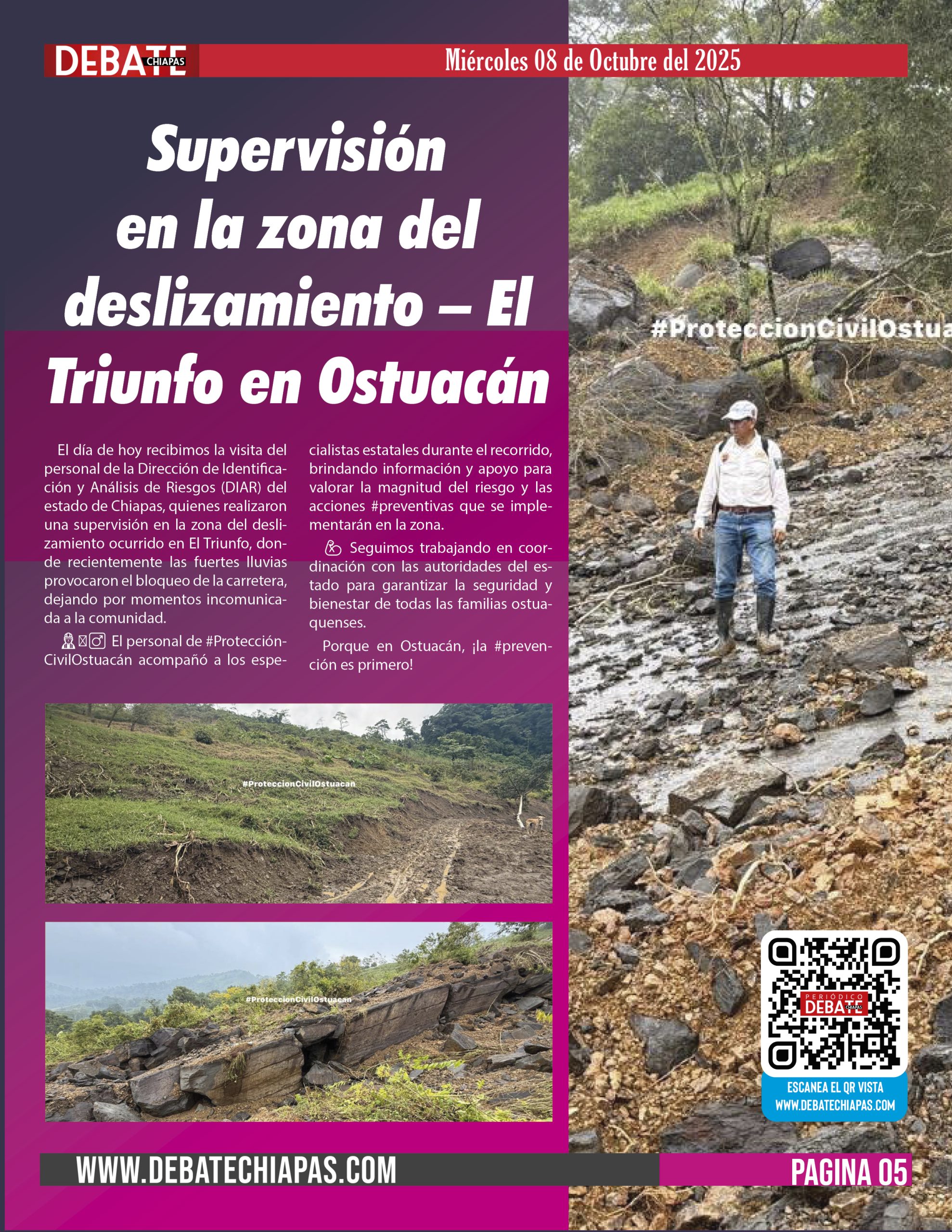 El día de hoy recibimos la visita del personal de la Dirección de Identificación y Análisis de Riesgos (DIAR) del estado de Chiapas, quienes realizaron una supervisión en la zona del deslizamiento ocurrido en El Triunfo, donde recientemente las fuertes lluvias provocaron el bloqueo de la carretera, dejando por momentos incomunicada a la comunidad.