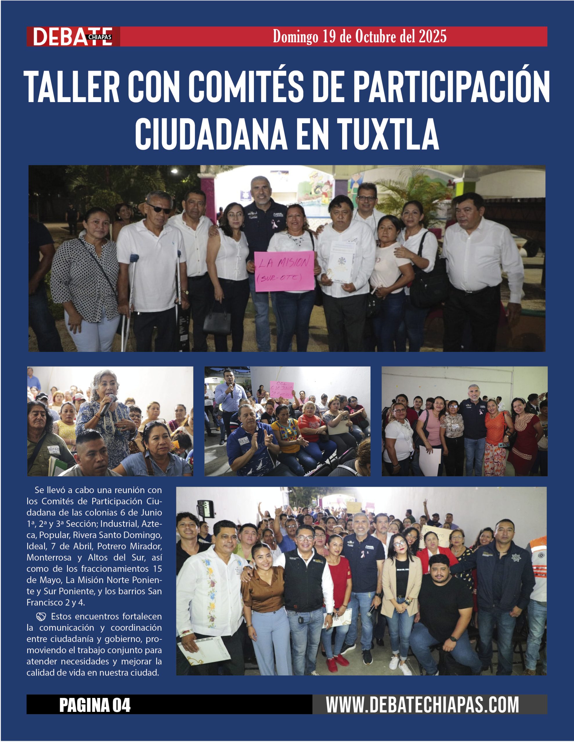 Se llevó a cabo una reunión con los Comités de Participación Ciudadana de las colonias 6 de Junio 1ª, 2ª y 3ª Sección; Industrial, Azteca, Popular, Rivera Santo Domingo, Ideal, 7 de Abril, Potrero Mirador, Monterrosa y Altos del Sur, así como de los fraccionamientos 15 de Mayo, La Misión Norte Poniente y Sur Poniente, y los barrios San Francisco 2 y 4.